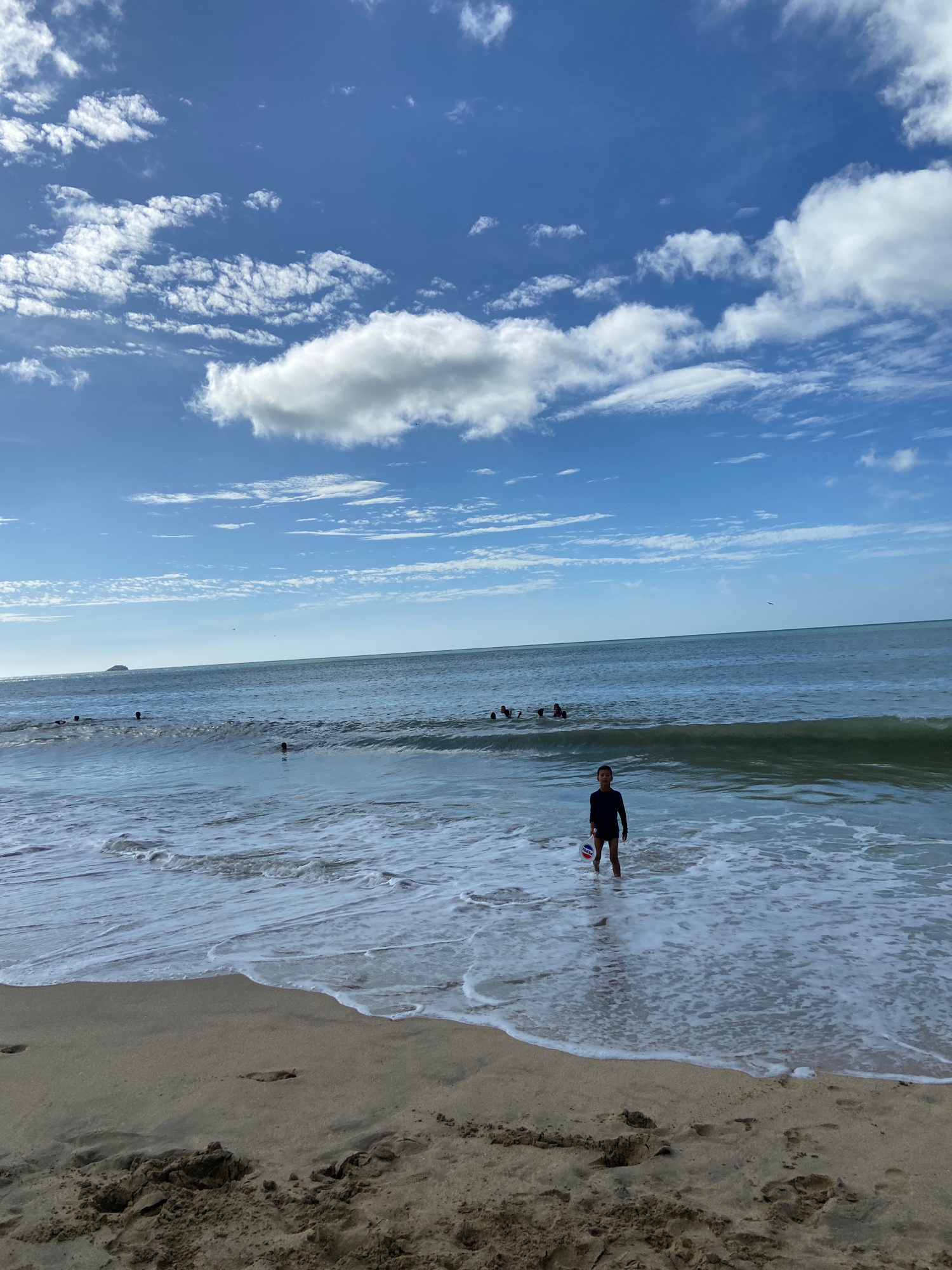 A medium-shot, horizontal, outdoor photograph depicts a beach scene in Pedro González, Venezuela. The beach runs from the foreground to the horizon line. The left side of the image is dominated by a s…read more