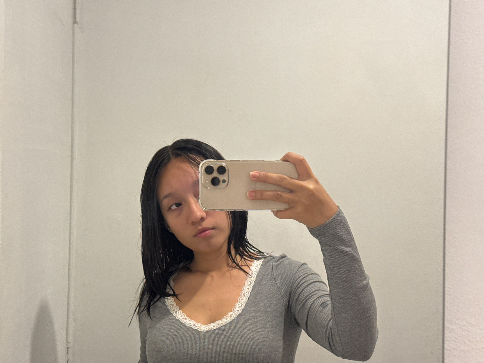 A young woman is taking a selfie with her phone. She is wearing a gray long-sleeved shirt with white lace trim around the neckline. Her hair is dark and appears to be wet. The background is a plain wh…read more