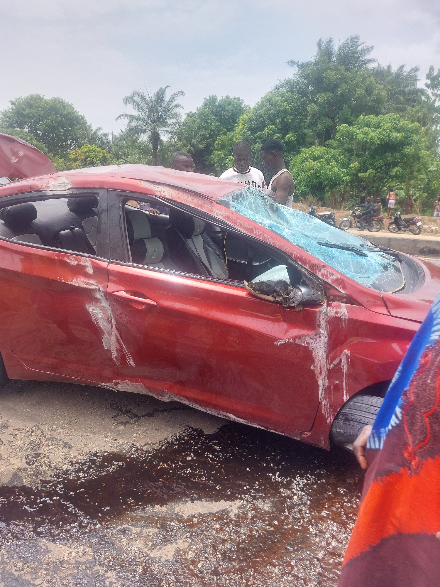 A severely damaged red sedan sits on the side of a road in Akwanga, Nigeria. The windshield is shattered, and the driver's side windows are broken. There is visible damage to the driver's side door an…read more