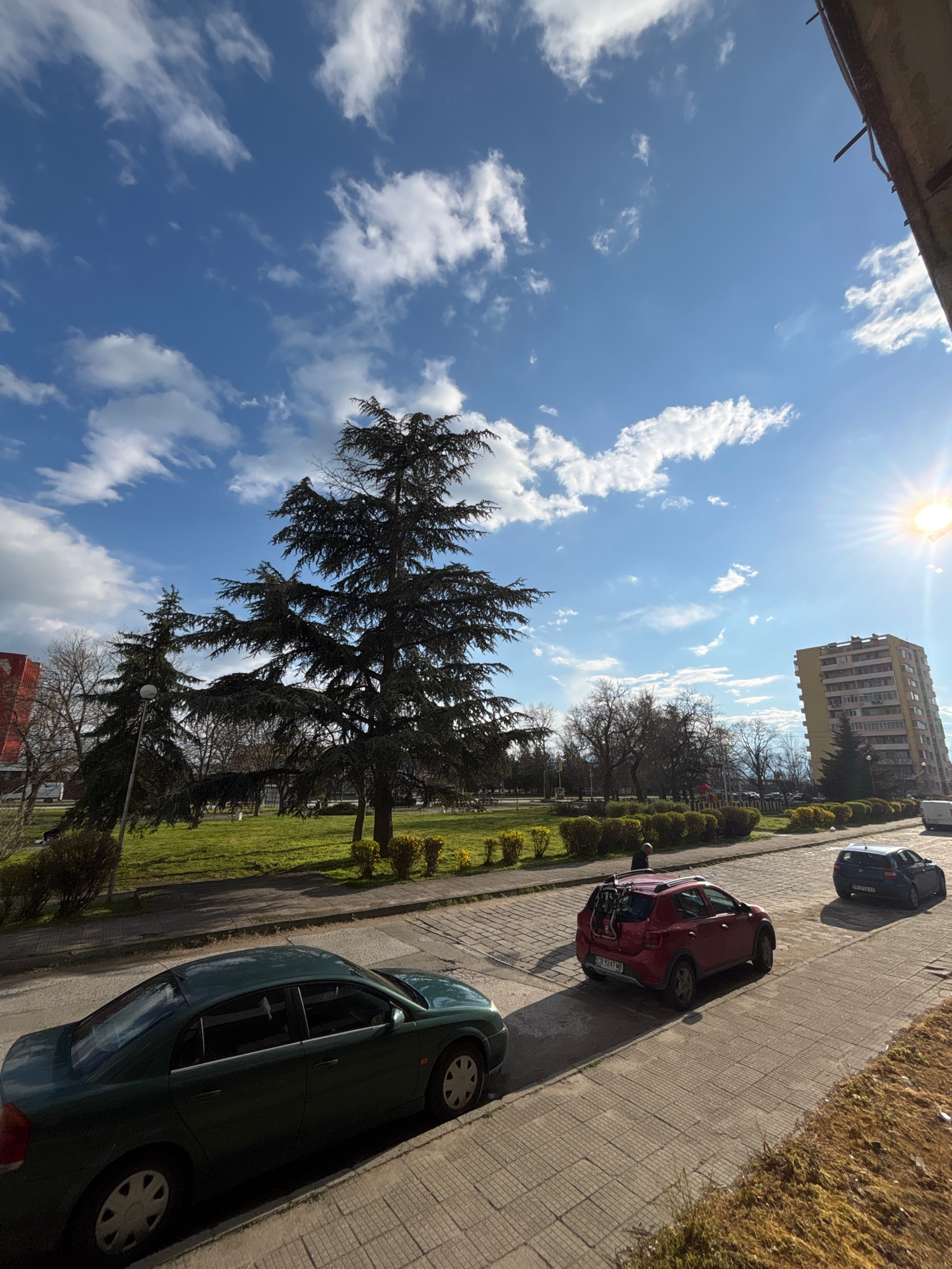 The image shows a street scene in Karlovo, Bulgaria. The sky is blue with scattered white clouds and a bright sun. A multi-story apartment building is visible in the distance. Along the right side of…read more