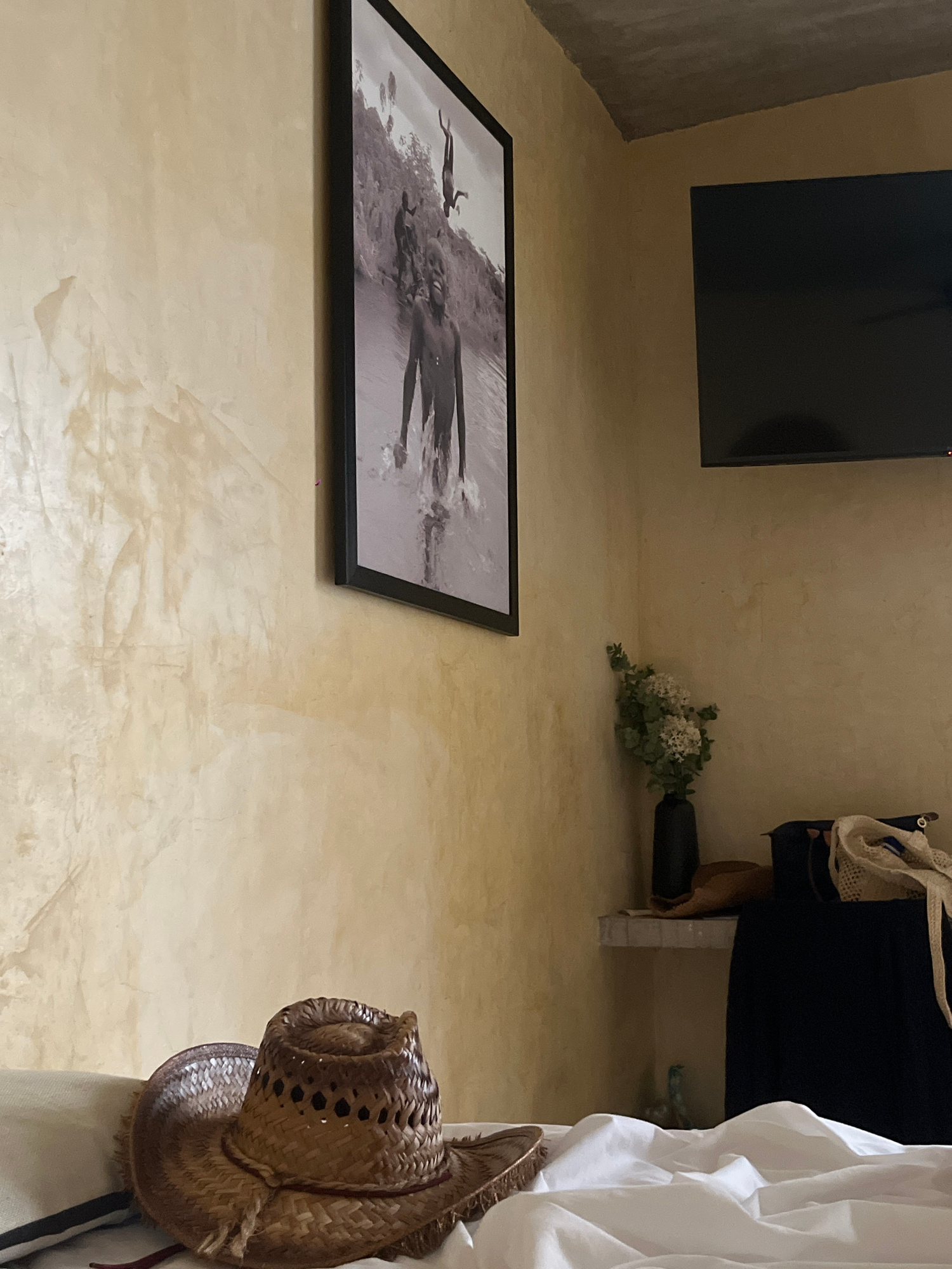 A low-angle shot in a room with textured beige walls and floor depicts a black-framed photograph lying on the floor, displaying a black and white image of people in water, possibly at a beach. In the…read more