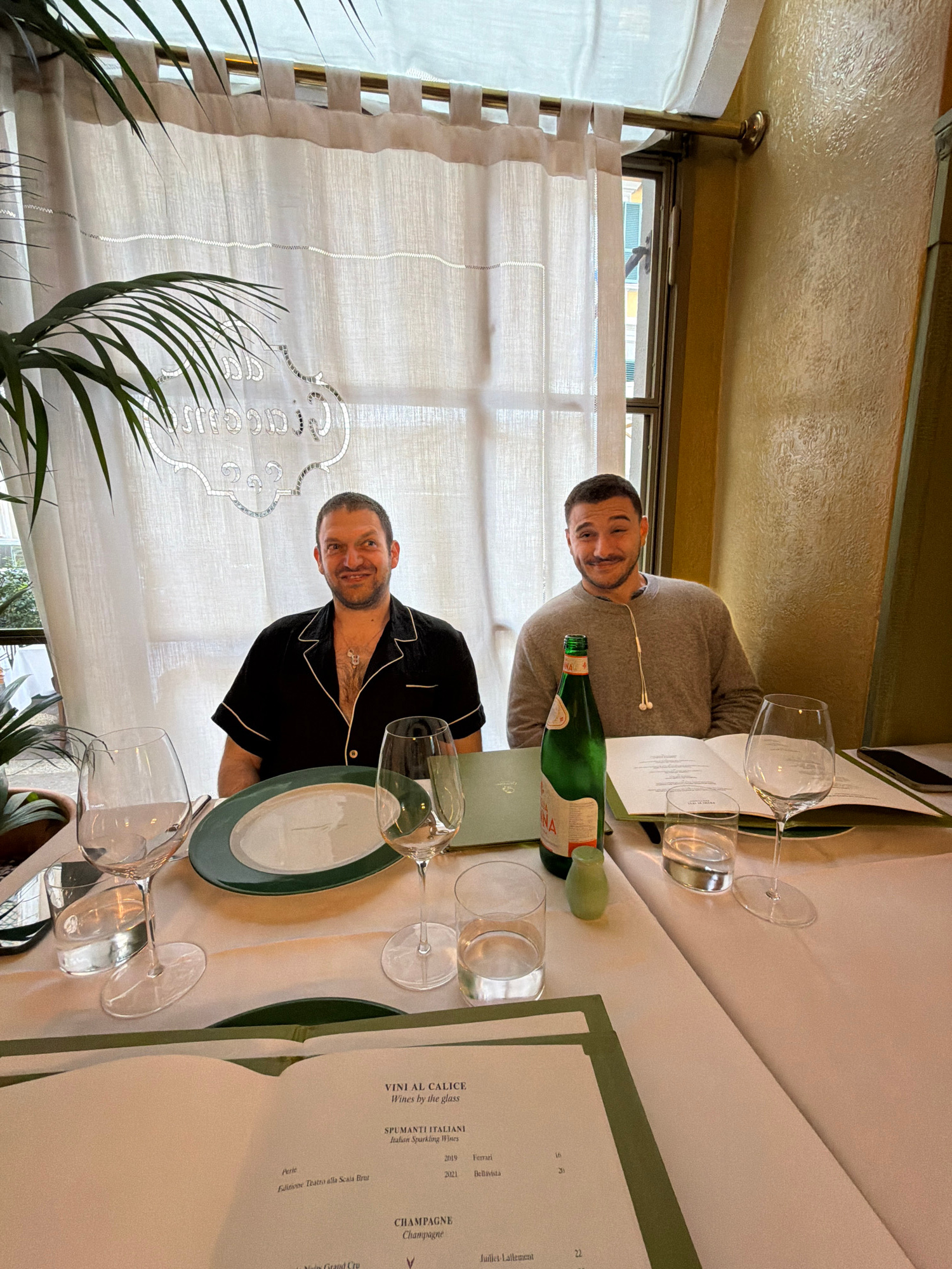 Two adult males are seated at a table within Giacomo Ristorante, located at Via Pasquale Sottocorno, 6, 20129 Milan MI, Italy. Both individuals are looking directly at the camera with smiles. The male…read more