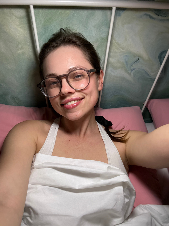 The scene, located in Scafati, Italy, depicts a female individual lying in a bed. She is looking directly at the camera with a smiling expression, displaying visible dimples and a glossy finish on her…read more