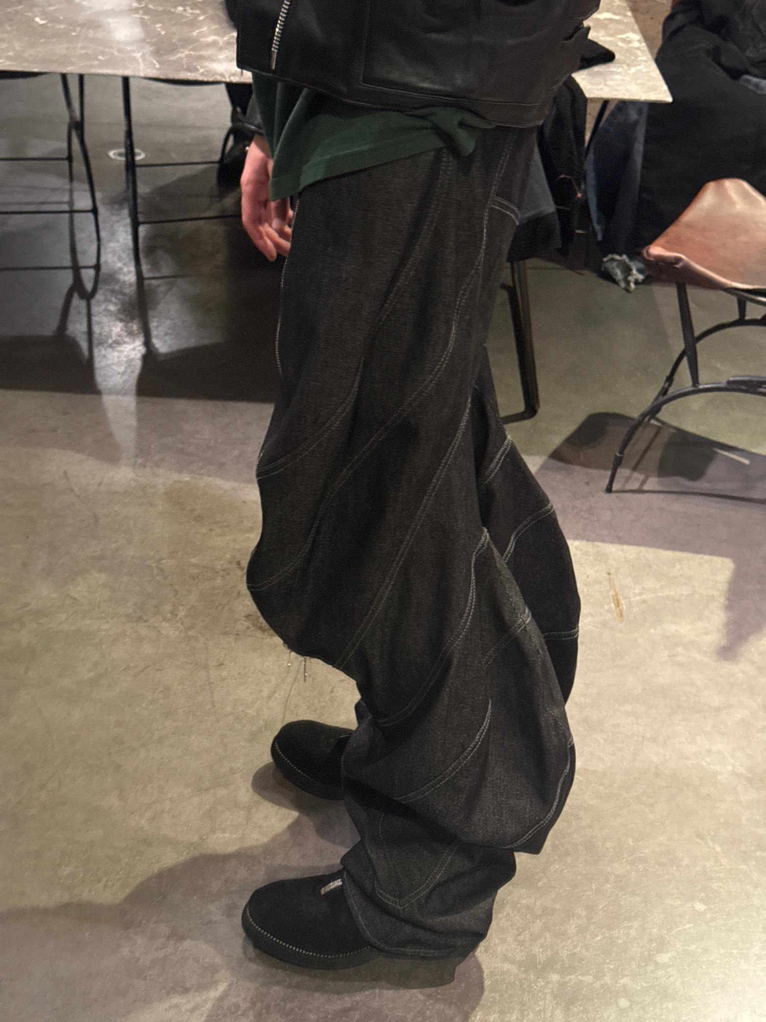 A person is standing indoors in what appears to be a restaurant or café. They are wearing dark, baggy denim pants and black shoes. They are also wearing a black leather jacket and a green shirt is vis…read more