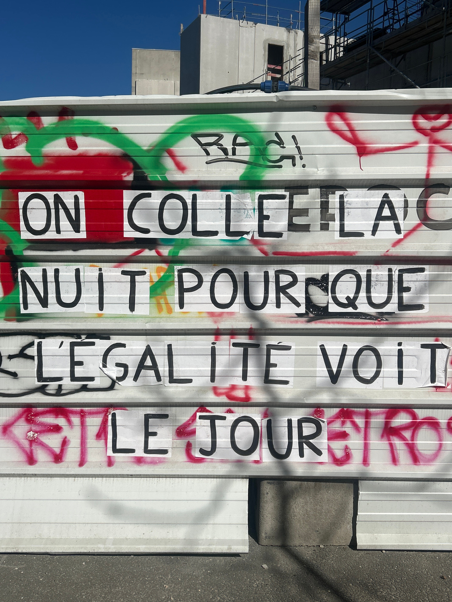The image shows a corrugated metal fence with graffiti and printed text. The text, arranged vertically on separate panels, reads "REGI," "ON COLLE LÀ," "NUIT POUR QUE," "L'ÉGALITÉ VOIT," "LE JOUR." Th…read more