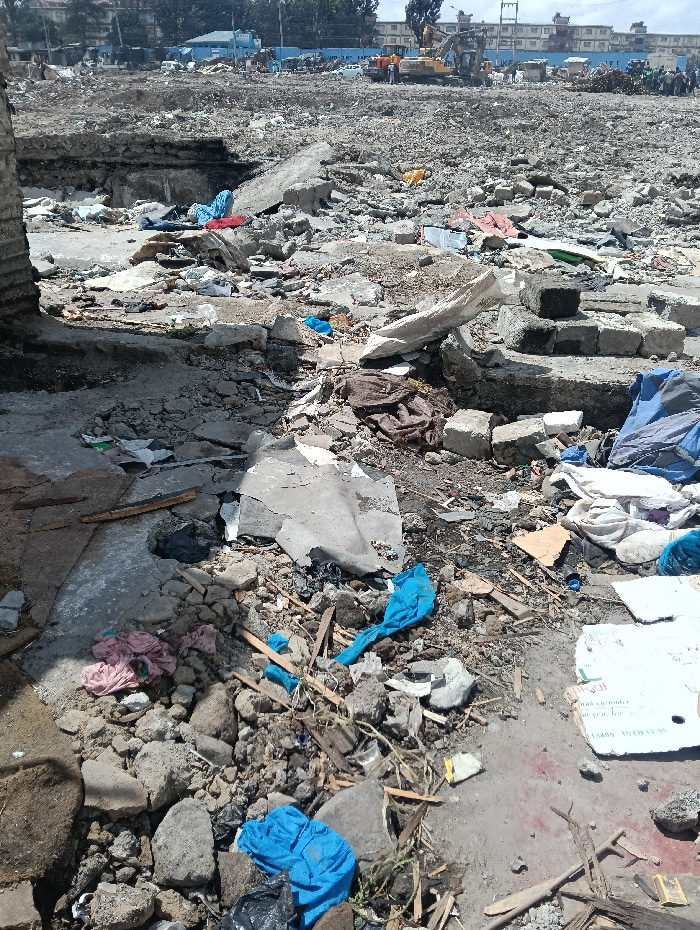 This image depicts a vast demolition site in Nairobi, Kenya, consistent with the Kariobangi demolitions. The scene is an expansive, uneven landscape of pulverized concrete, broken masonry, twisted reb…read more