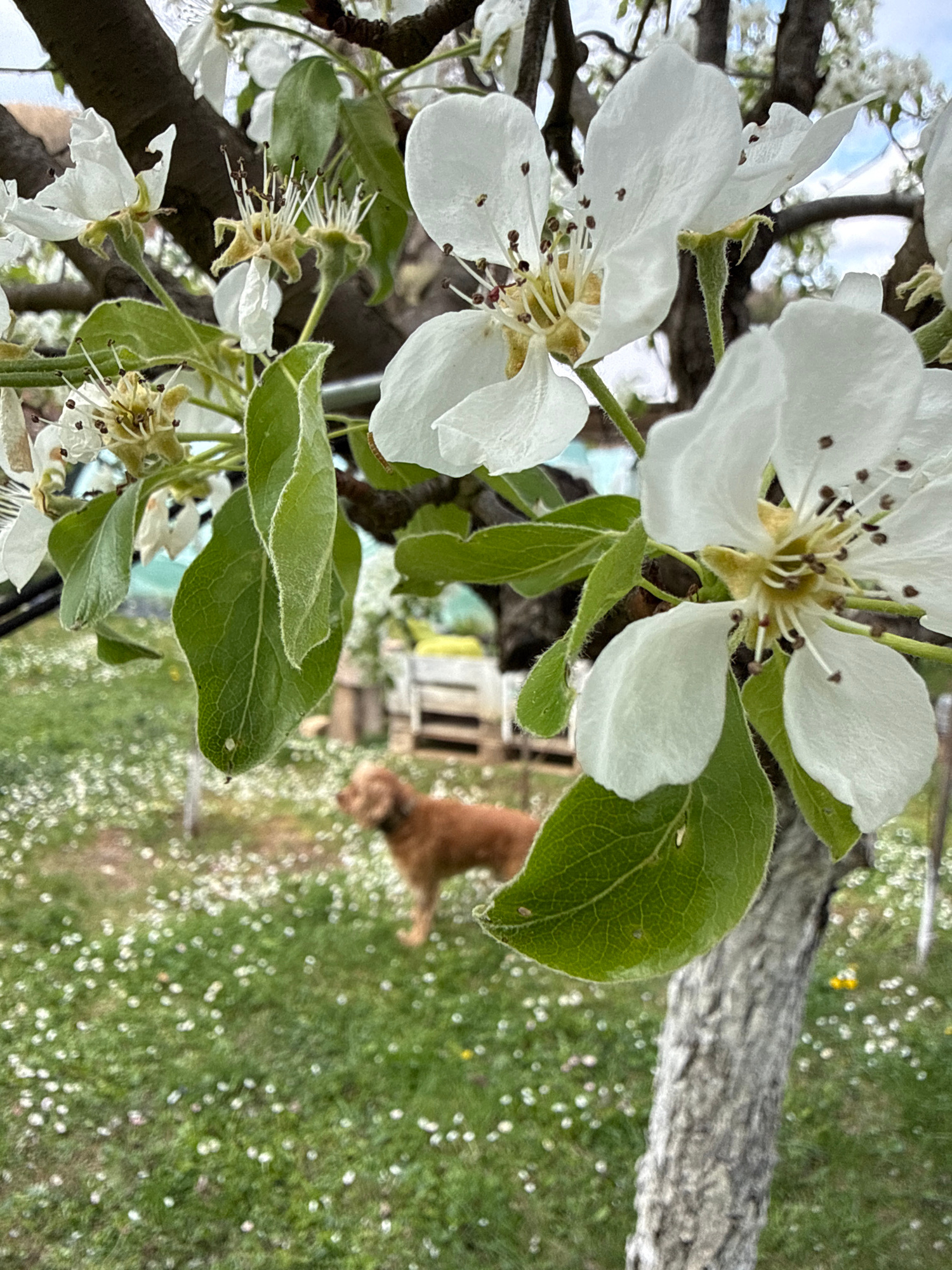 Close-up shot of white tree blossoms with green leaves. Background shows grass with small white flowers and a blurred brown dog. Appears to be outdoors on a sunny day. No identifiable information conf…read more