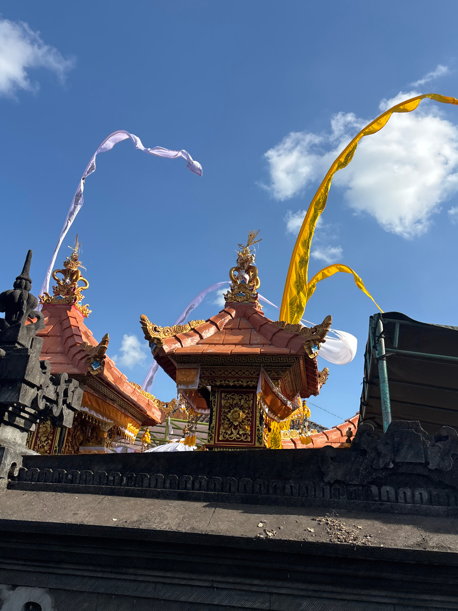 The image shows a partial view of a Hindu temple structure in Tabanan, Indonesia. The temple is decorated with traditional Balinese carvings, gold accents, and flowing yellow and white ribbons. The sk…read more