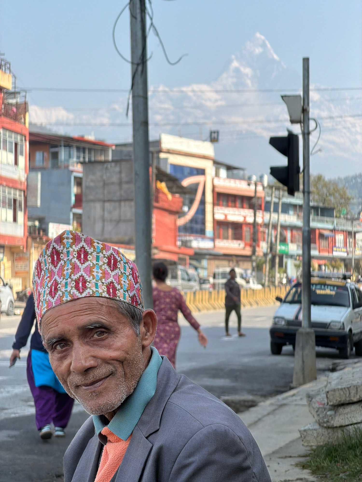 An eye-level shot presents an elderly man in a grey blazer and patterned hat. He looks directly into the camera with a slight smile. He stands in front of a city street in Pokhara, Nepal. A traffic li…read more