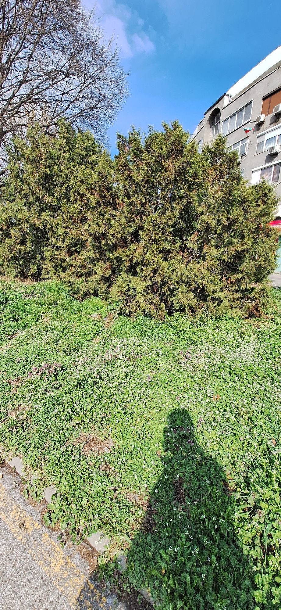 The image depicts a street scene in Burgas, Bulgaria. The frame is angled upwards, capturing a partial view of a multi-story grey building with windows. A conifer tree dominates the center of the fram…read more