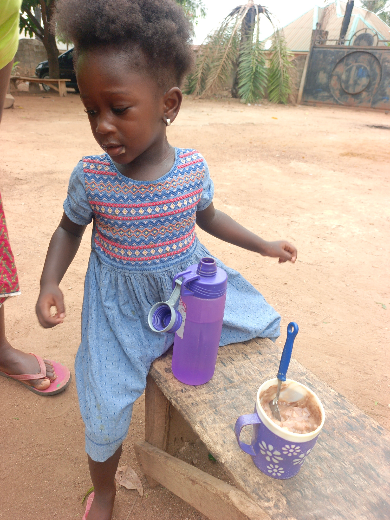 A young child with dark skin and short, curly hair stands near a wooden bench in what appears to be an outdoor setting. The child is wearing a blue dress with a patterned bodice and is looking down. There is a purple water bottle with an attached lid, and a purple mug with white flowers containing a food item and a blue spoon, both placed on the bench. A person wearing red patterned cloth and pink flip-flops stands in the background, partially cropped from the image. The ground is reddish-brown dirt. In the background, there is vegetation, a car, a wooden structure, and a metal gate. The location is indicated as Akwanga, Nigeria. | Open Wire