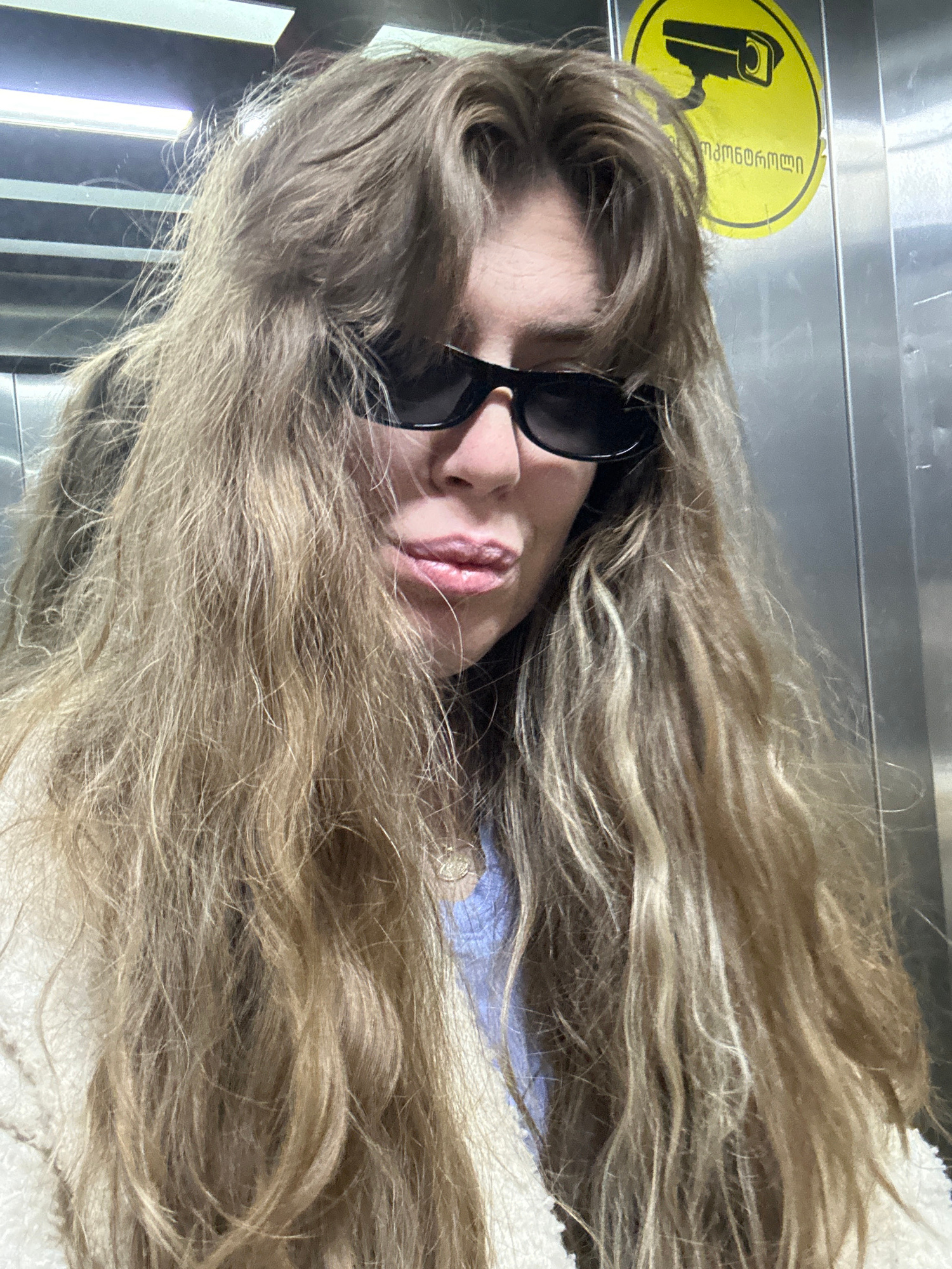 The image features a person, likely female, with long, wavy, light brown and blonde hair cascading across the frame. She is wearing black, rectangular sunglasses that cover her eyes, and her lips are…read more