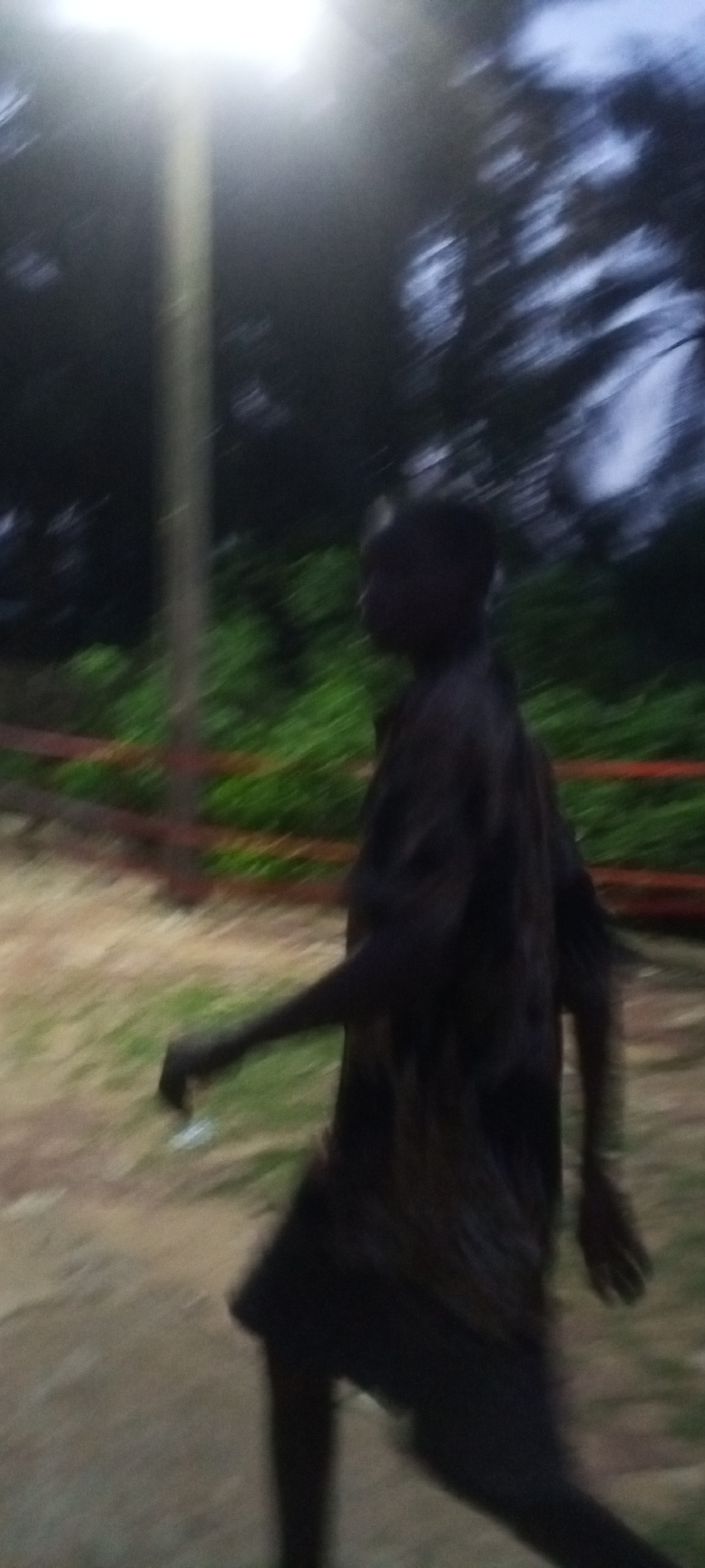 A person is walking on a path near Alor, Nigeria at dusk or night. The person is wearing dark clothing. There is a light pole in the background and greenery. The photo is blurred.
