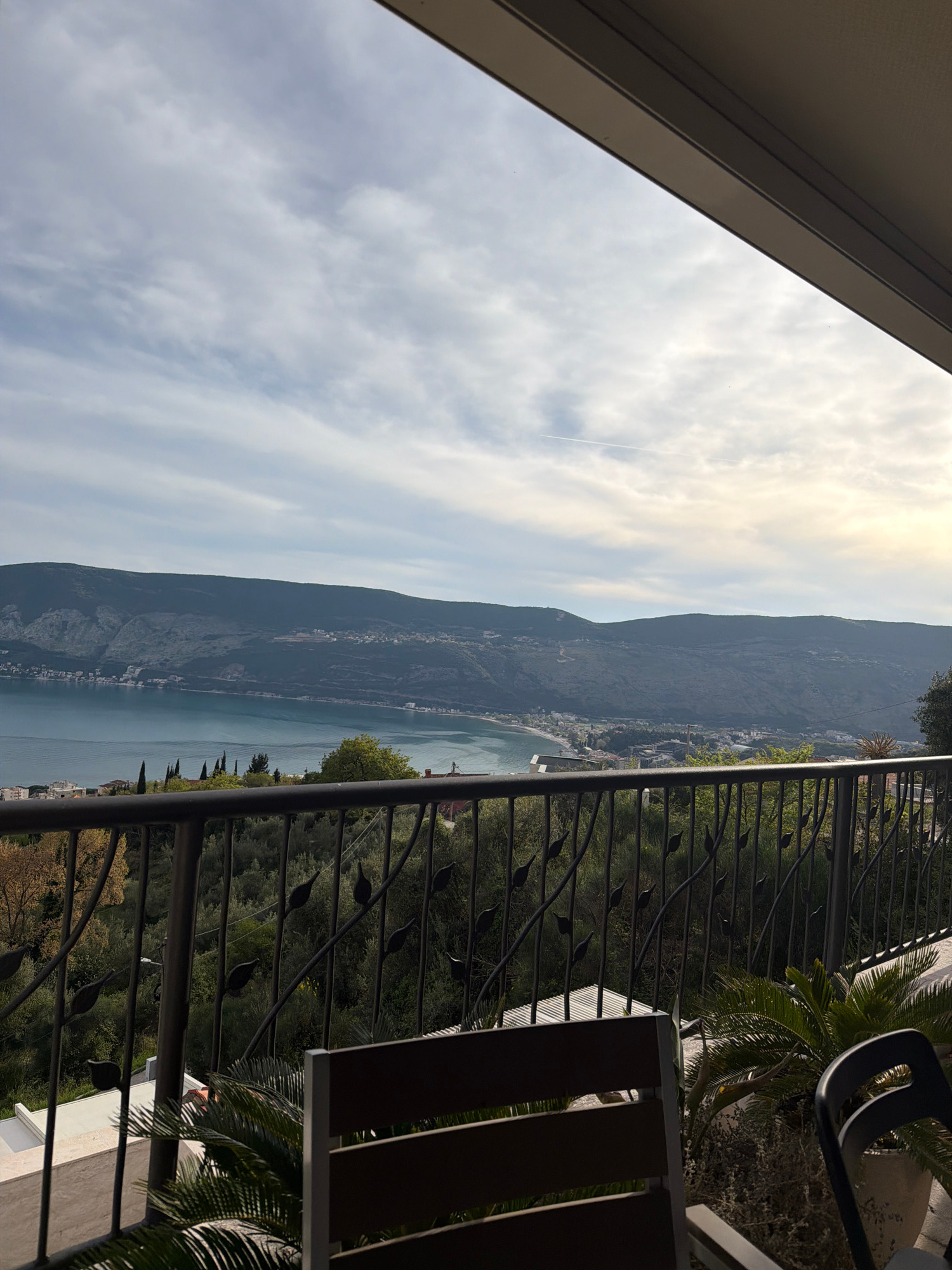 View from a balcony in Trebesin, Montenegro. The balcony has a decorative metal railing and furniture. Beyond the railing, there is a landscape featuring a body of water with a mountain range extendin…read more