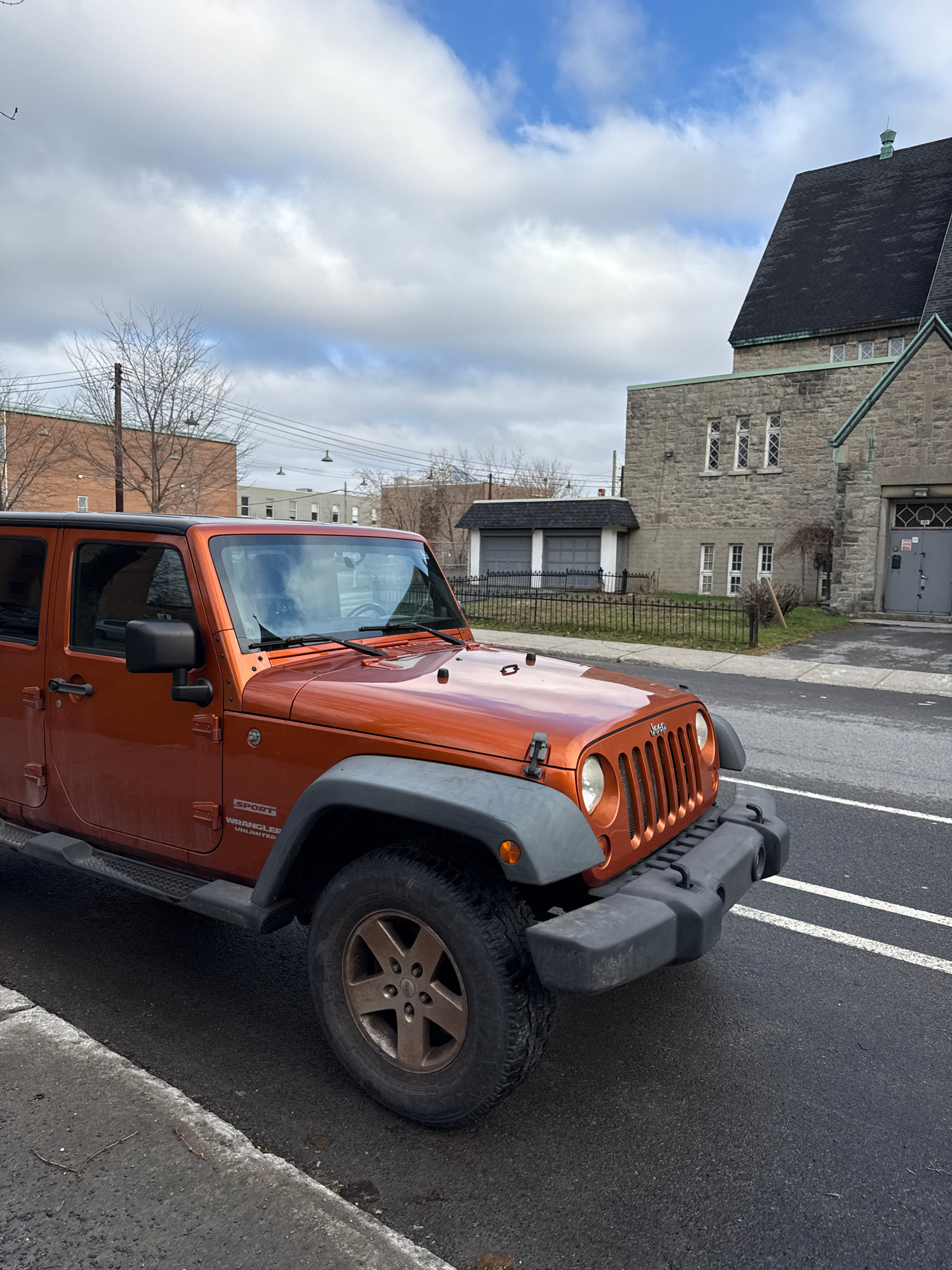 An orange Jeep Wrangler Unlimited Sport is parked on the side of a street in what appears to be Montreal, Canada. The vehicle, seen from its front quarter panel, features a black plastic bumper, grill…read more