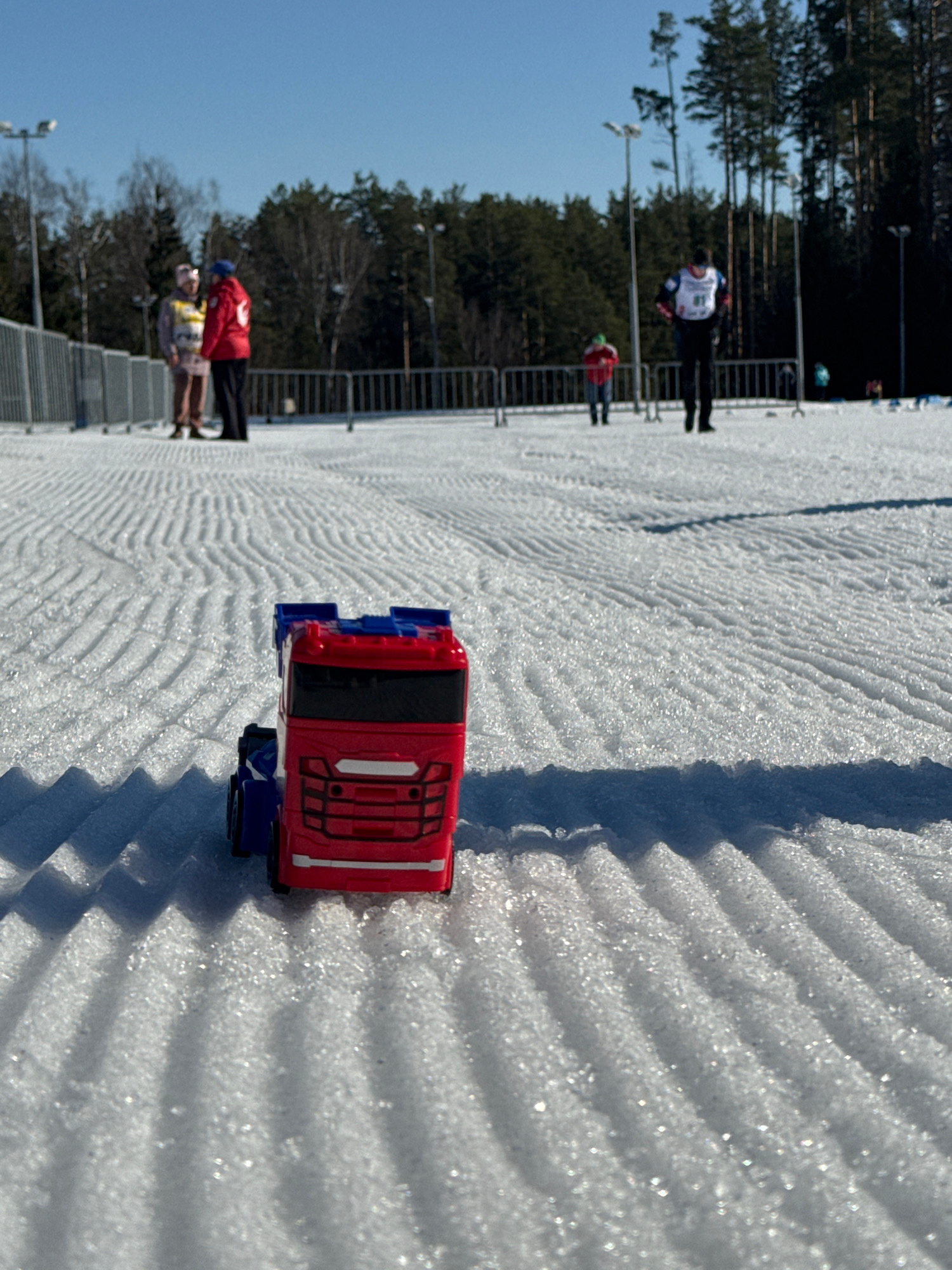 A red and blue toy semi-truck is positioned on a snowy, textured surface. The texture appears to be from a ski trail. In the background are several people standing near a fence line, and beyond the fe…read more