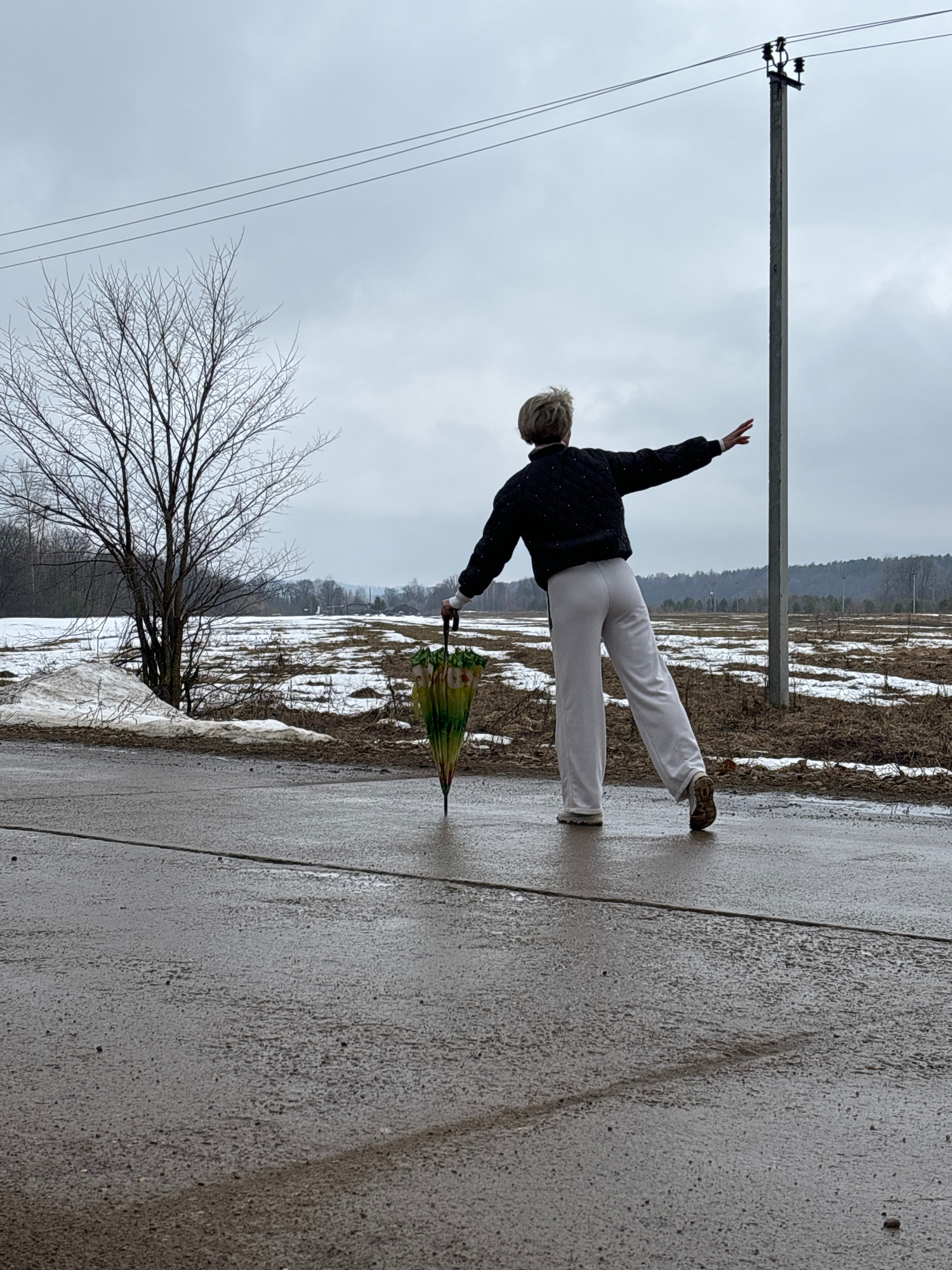 A woman is standing in a yoga pose on a gray asphalt surface, possibly a road or sidewalk. She is wearing white pants, a dark jacket with light-colored polka dots, and brown shoes. Her left arm is rai…read more