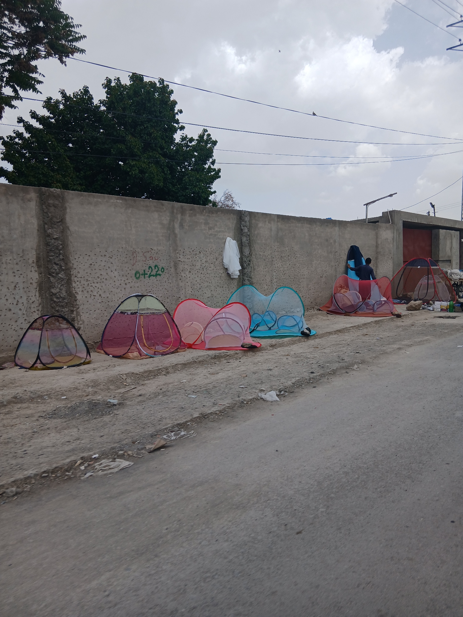 The image, taken in Quetta City Tehsil, Pakistan, shows a series of small, collapsible, colorful shelters or tents lined up against a concrete wall. The tents appear to be made of netting or mesh mate…read more