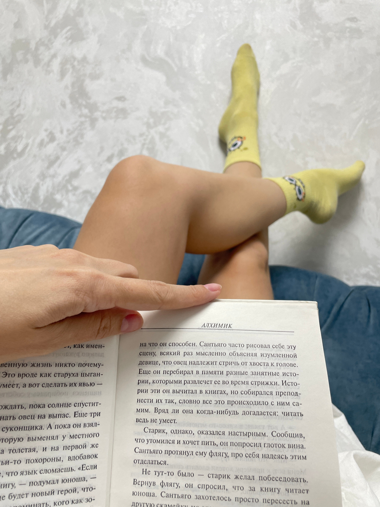 A person is sitting with crossed legs, wearing yellow socks with cartoon eyes, and reading a book in Russian. The book is titled "Алхимик" (The Alchemist). The person's hand is holding the book open,…read more