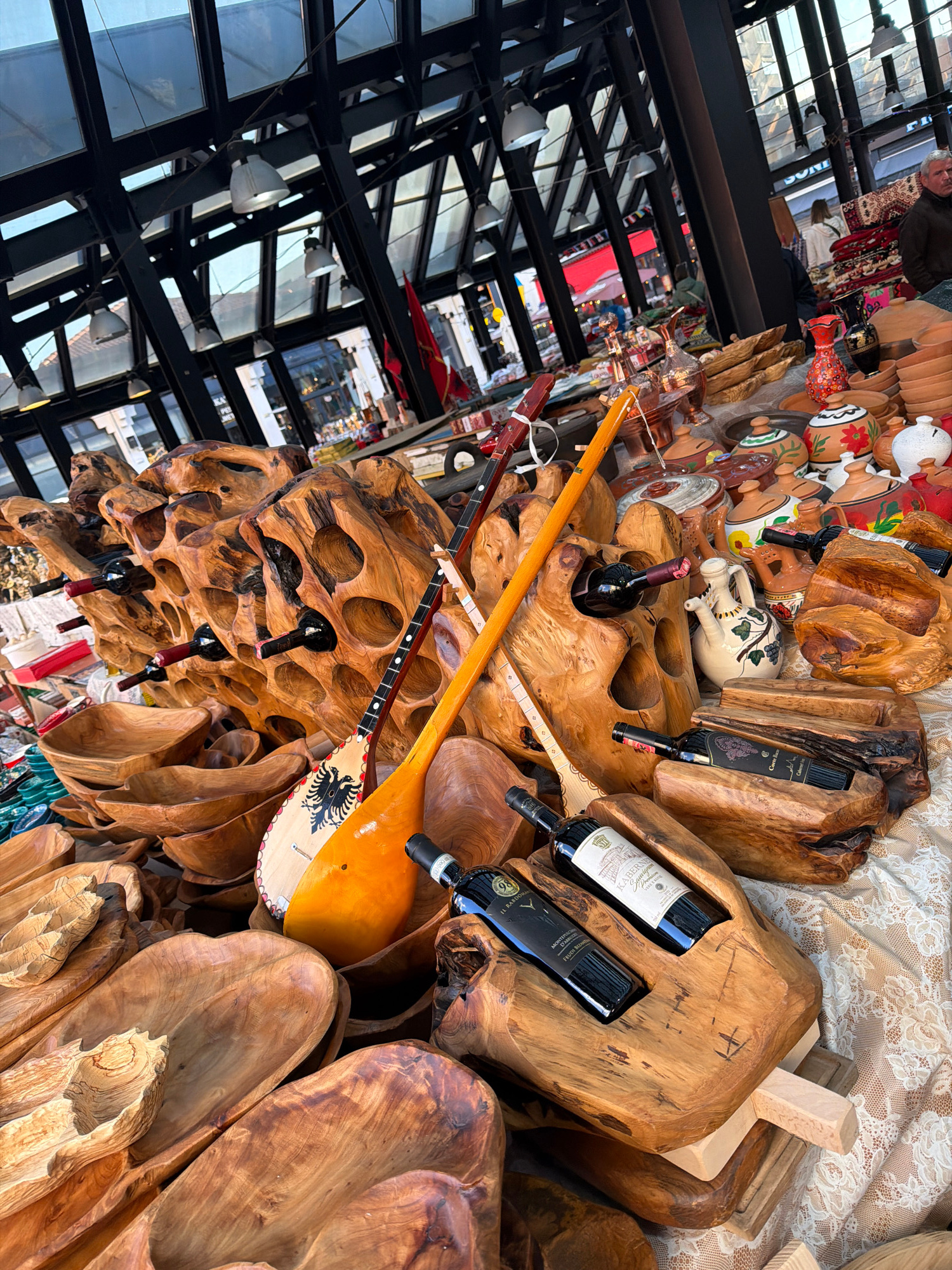 The image shows an array of handcrafted wooden items for sale, including bowls, wine holders, and a musical instrument resembling a lute. The objects are densely packed on a display surface. Wine bott…read more