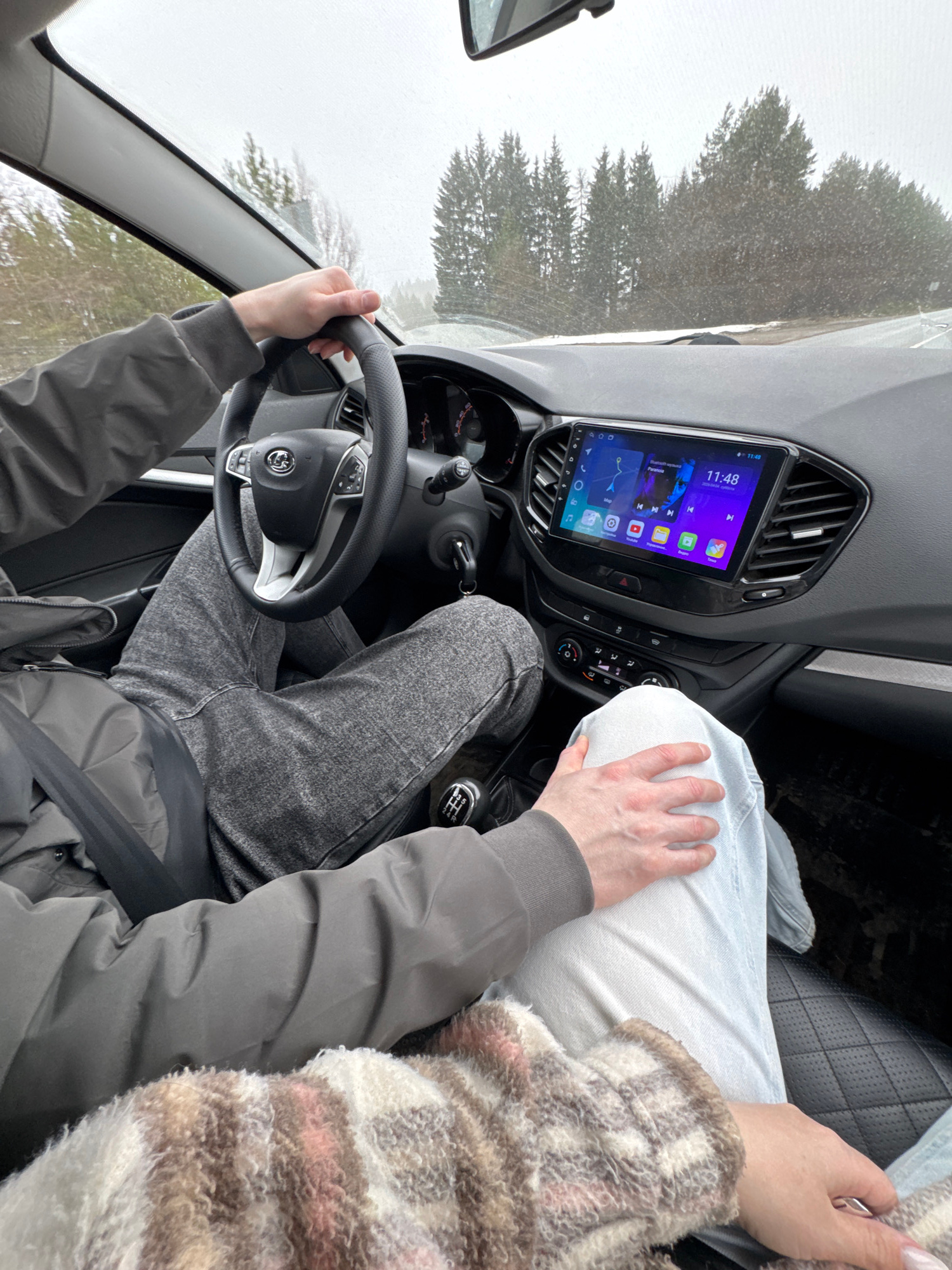 The image shows an interior view from inside a car, focusing on the driver and front passenger. The driver is holding the steering wheel, wearing gray jeans and a jacket. The passenger is wearing lighβ¦read more