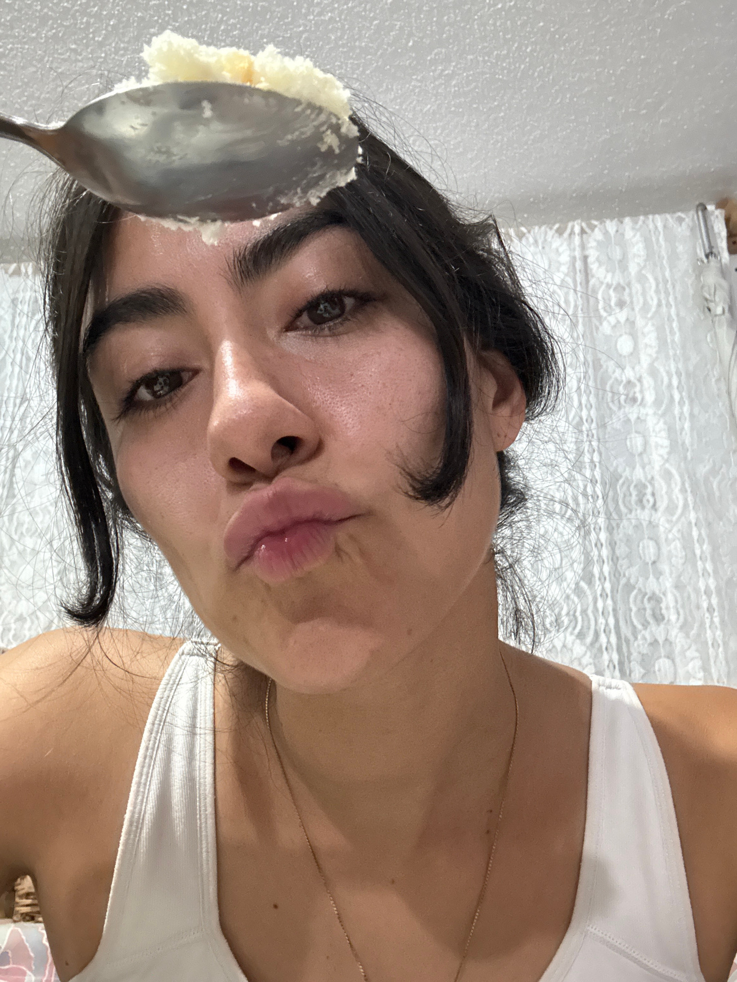 A young woman is holding a spoon of white dessert in front of her face. She is wearing a white top and a gold necklace. The background is a white lace curtain. There is no evidence in the photo to sug…read more