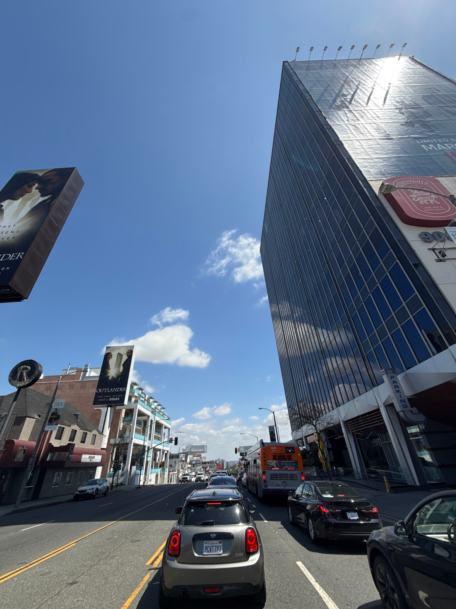 The image depicts a street scene in West Hollywood, United States of America. A tall skyscraper with a reflective facade dominates the upper left of the frame, bearing signs for "Christians", "Limited…read more