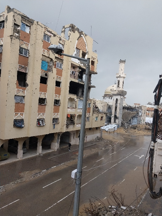 This vertical image captures a scene of widespread urban devastation under an overcast sky in Khan Yunis, Palestinian Territory. In the foreground, a multi-story building, likely residential, stands…read more