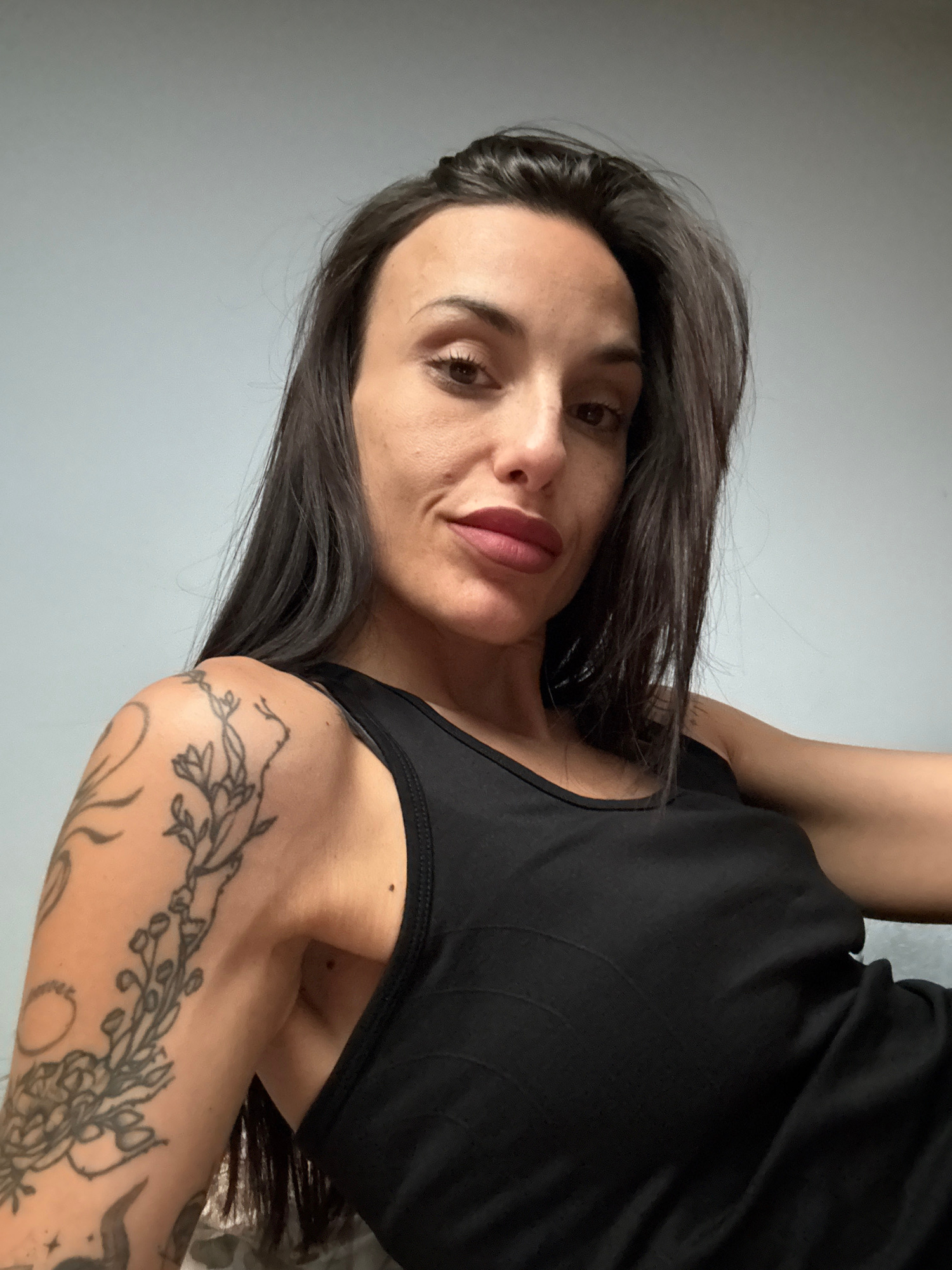 A woman with long, dark hair is wearing a black tank top and has a floral tattoo on her upper arm. The background is a plain, light gray wall. The image appears to be taken from a slightly low angle.…read more