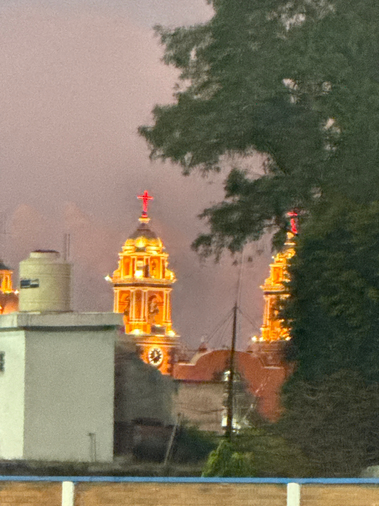 The image captures a nighttime view of the illuminated towers of the Santuario de la Virgen de los Remedios church in San Andrés Cholula, Mexico. The church is partially obscured by trees in the foreg…read more