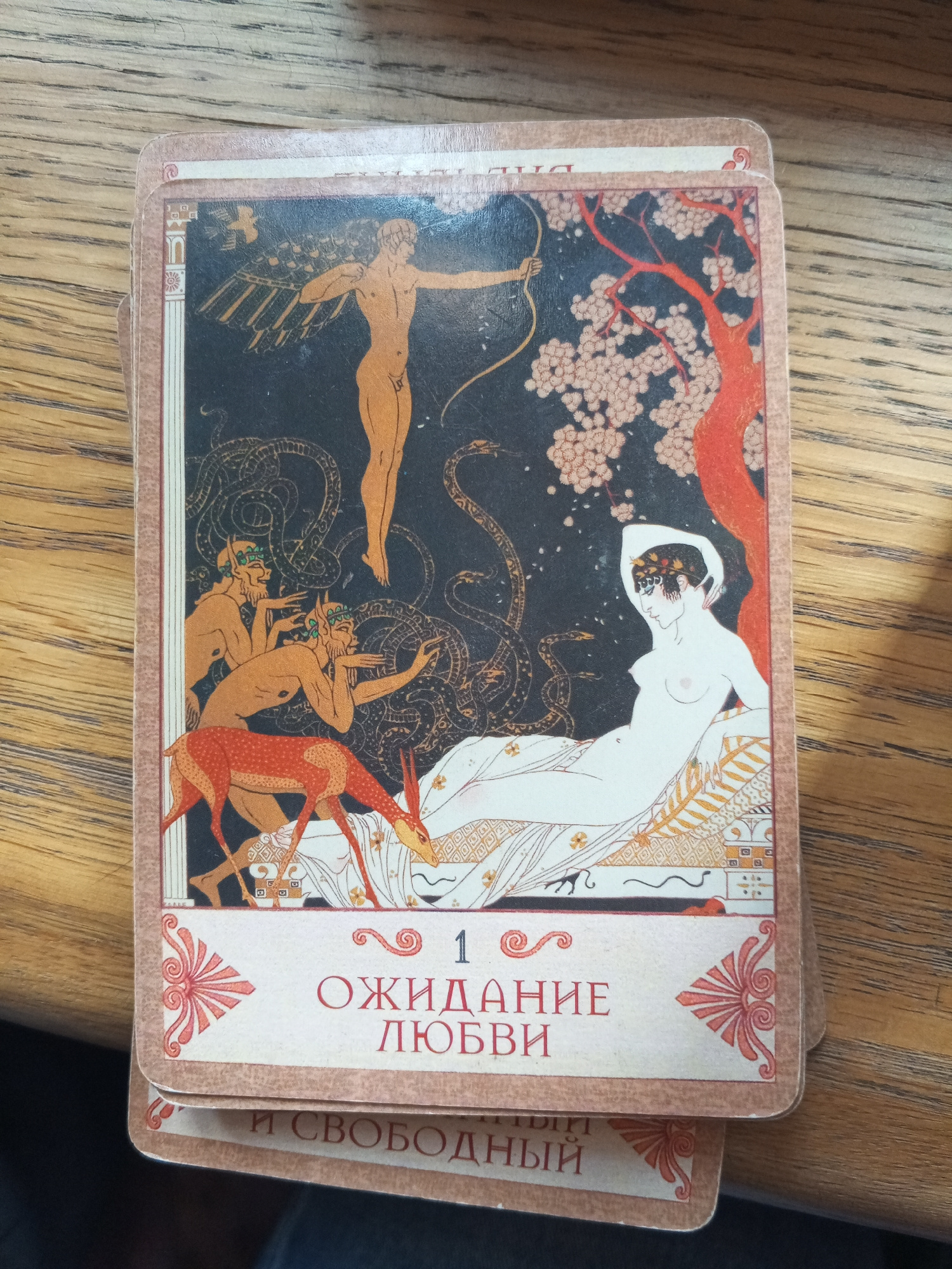 The scene captures a stack of divination cards resting on a wooden surface with visible grain. The top card, centrally positioned, features an illustration in a classical, Art Nouveau style against a dark background. At the top center of the illustration, a nude, winged male figure with light orange-brown skin is depicted airborne, drawing a bow. Below him, two nude, satyr-like male figures with pointed ears and small horns or wreaths on their heads interact with intertwined golden serpents. To the bottom left, a reddish-orange deer or fawn with antlers stands in profile, facing right. On the right side of the illustration, a pale white nude female figure reclines on an ornate bed with patterned fabric, beneath a red-trunked tree adorned with light-colored blossoms. The card's bottom border displays decorative elements, including classical columns on the left, and features the number '1' and the Russian text "ОЖИДАНИЕ ЛЮБВИ" (WAITING FOR LOVE). Partially visible beneath the top card, a second card shows the Russian text "И СВОБОДНЫЙ" (AND FREE). The wooden surface supporting the cards exhibits a medium brown hue with distinct horizontal grain patterns. No visual elements within the image identify a specific geographic location within Saint Petersburg, Russia, or any other city. | Open Wire