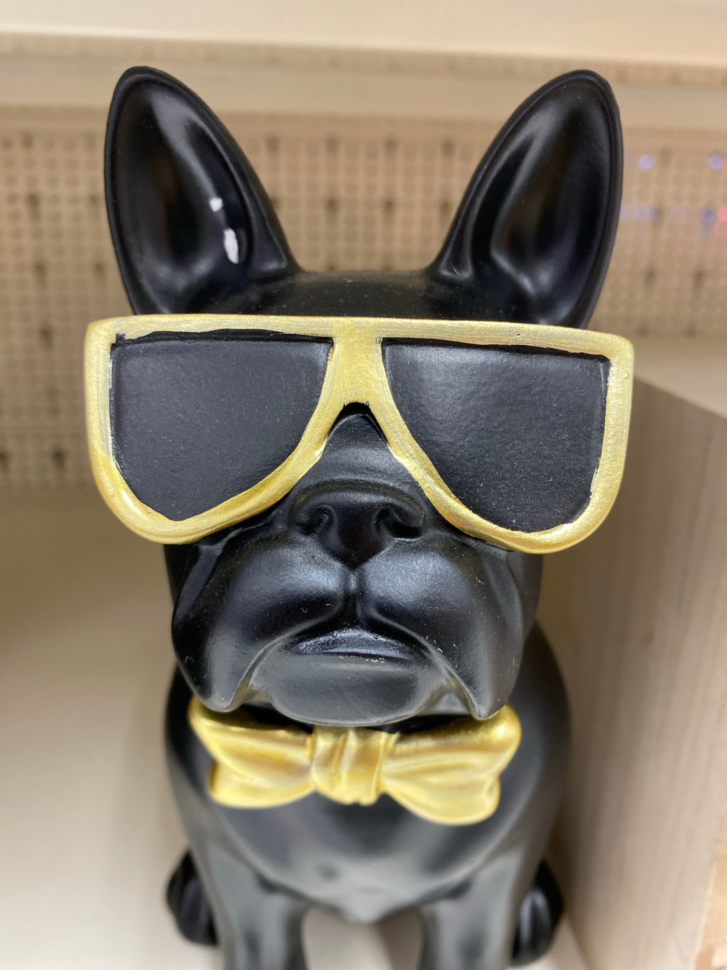 The image displays a black figurine of a French Bulldog, or a similar short-nosed dog breed, lying on its left side. The figurine is made of a dark, matte material, possibly ceramic or resin. It is ad…read more