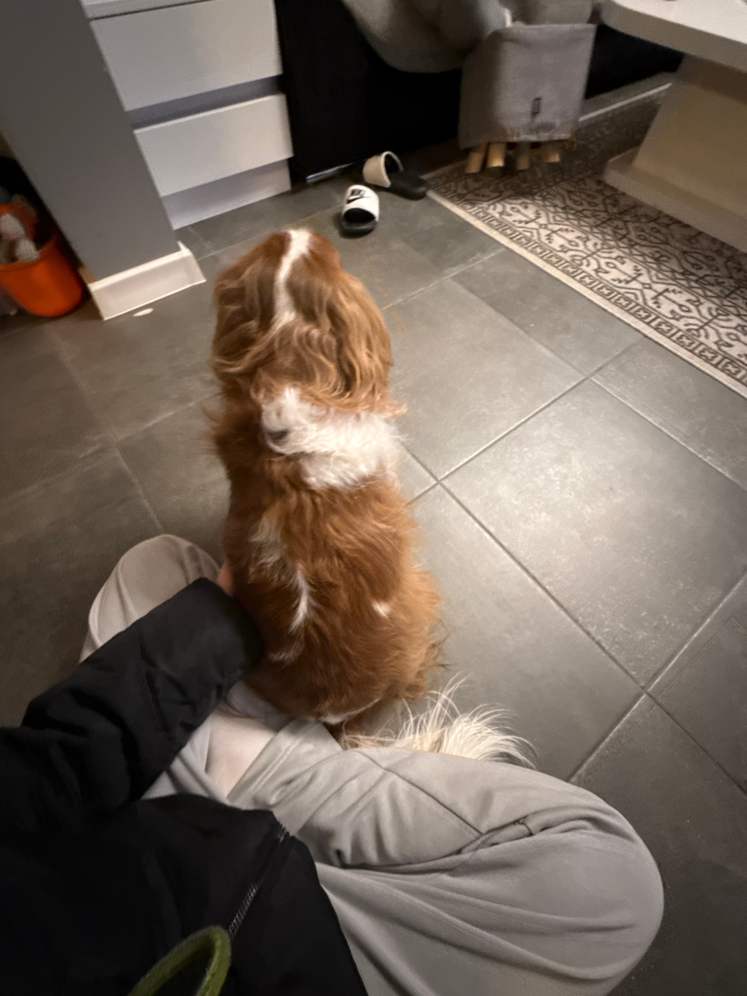 A top-down shot shows a person and a Cavalier King Charles Spaniel dog on a grey tiled floor. The person is wearing light grey sweatpants, a black jacket, and has a green object visible in the jacket.…read more
