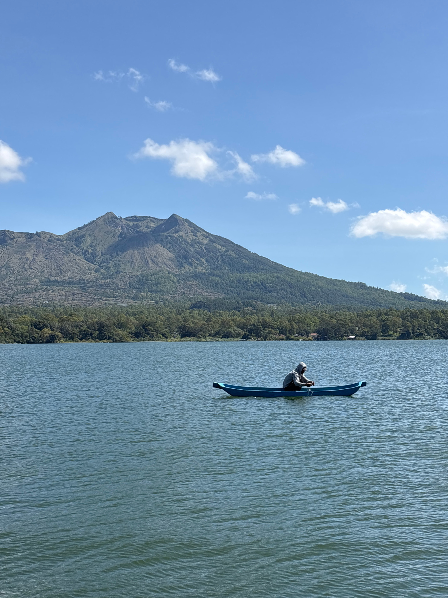 The image shows a person in a blue outrigger canoe on Lake Batur, near Kintamani, Indonesia. The lake is surrounded by the caldera wall of Mount Batur. The sky is blue with scattered clouds. The perso…read more
