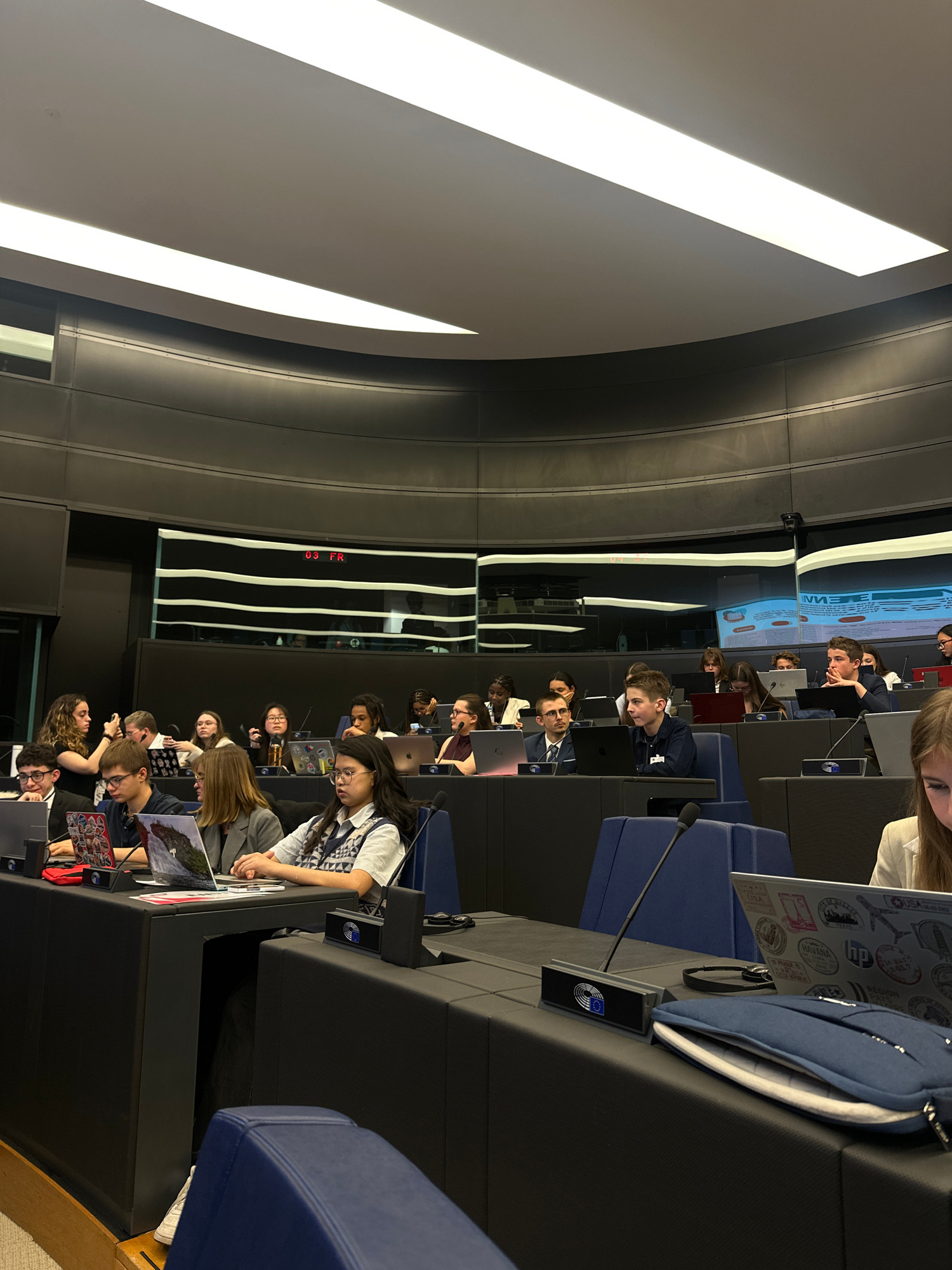 The image shows an interior view of the European Parliament in Strasbourg, France. Multiple rows of seated individuals are present, each person appearing to be working with a laptop or engaging with m…read more