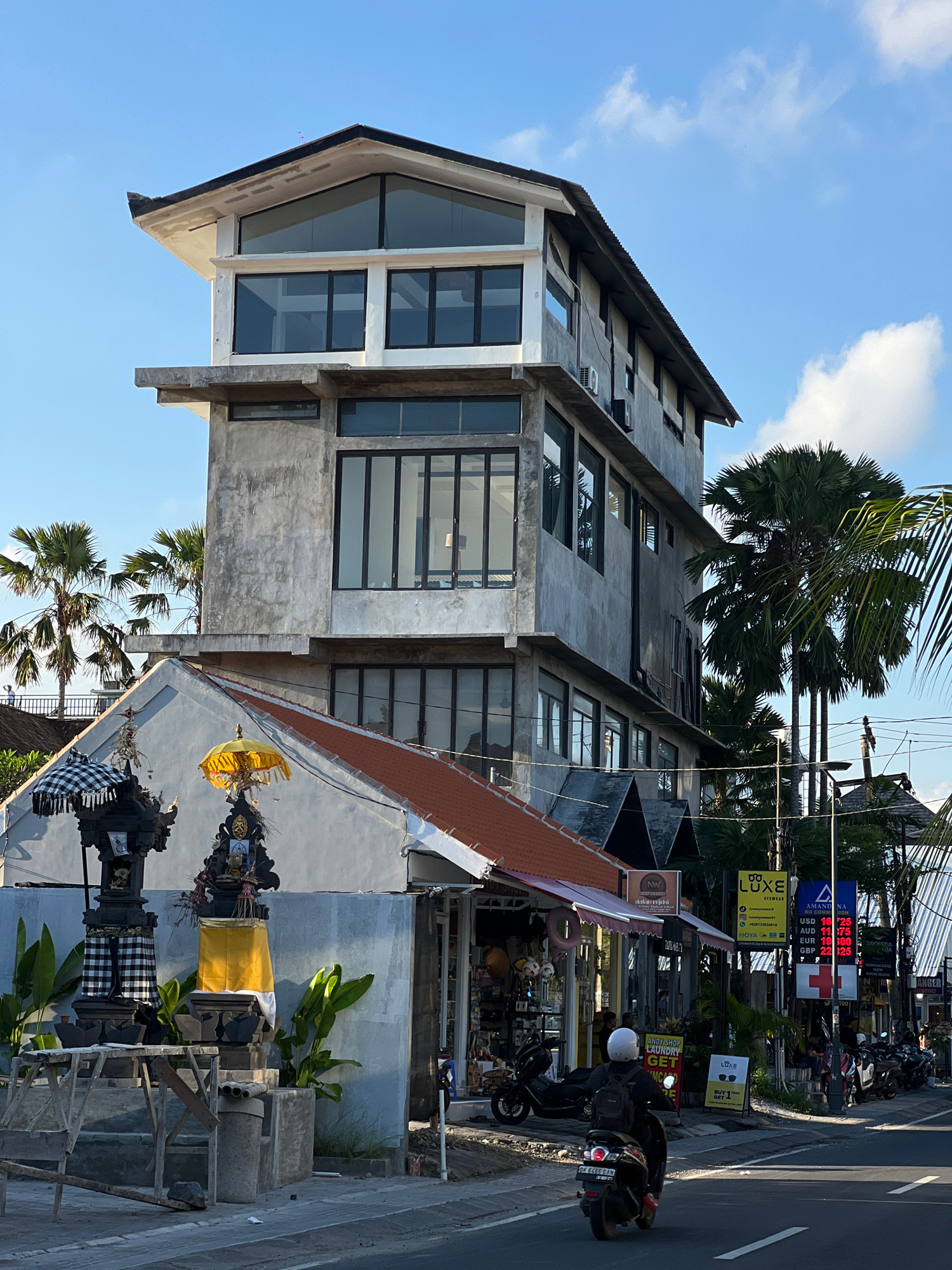 The image depicts a street scene in North Kuta, Indonesia. A modern four-story building with a concrete facade and large windows dominates the left side of the frame. A palm tree is visible behind the…read more