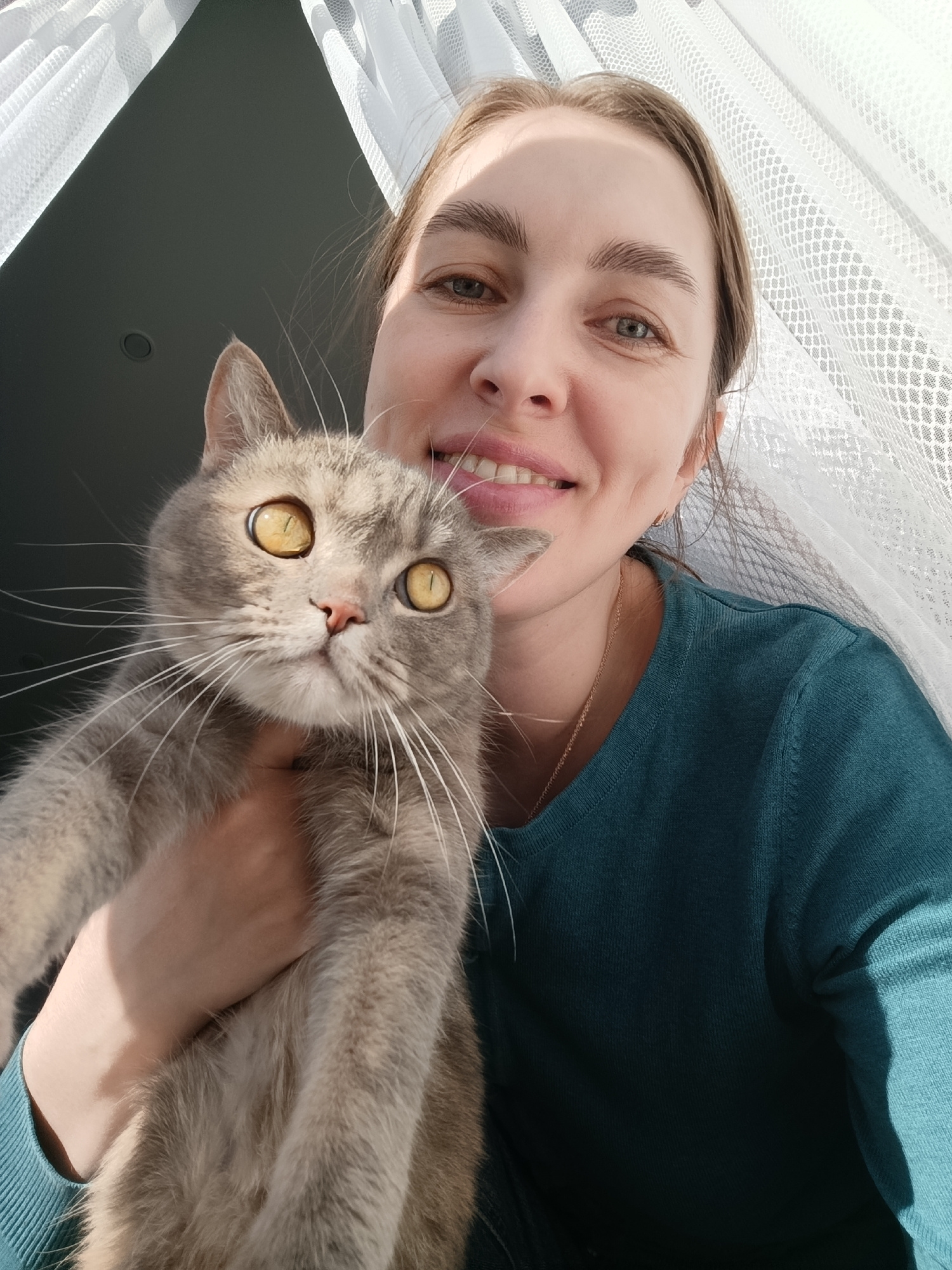 A light-skinned woman is holding a grey cat in her arms, both facing the camera. The woman is smiling, showing her teeth. She has light brown hair pulled back and is wearing a dark teal long-sleeved s…read more
