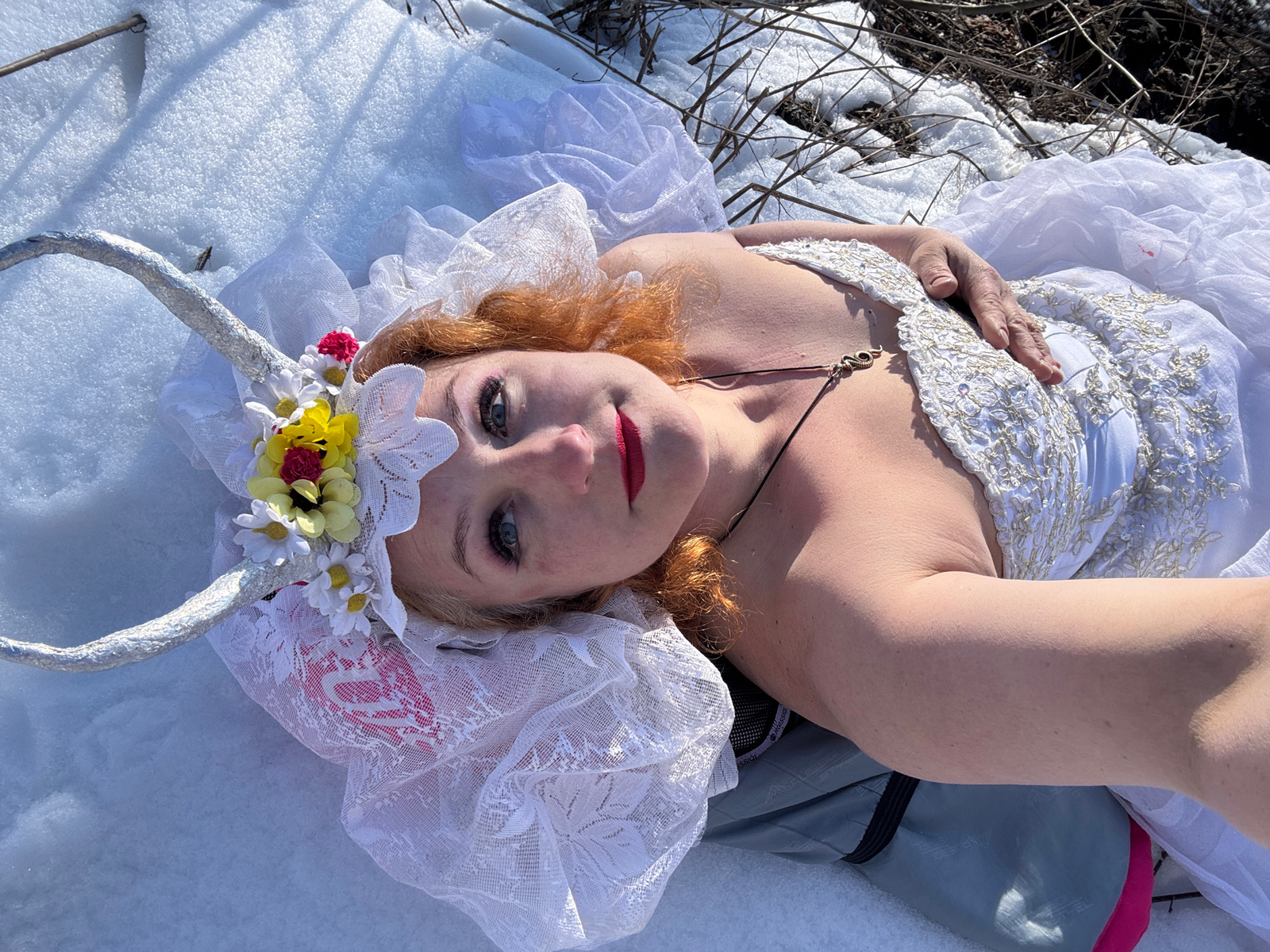 A woman is lying on her back in the snow in a sunny, outdoor environment. She is dressed in a white gown with gold embroidery, and a lace headpiece adorned with flowers and silver horns. Her face is t…read more