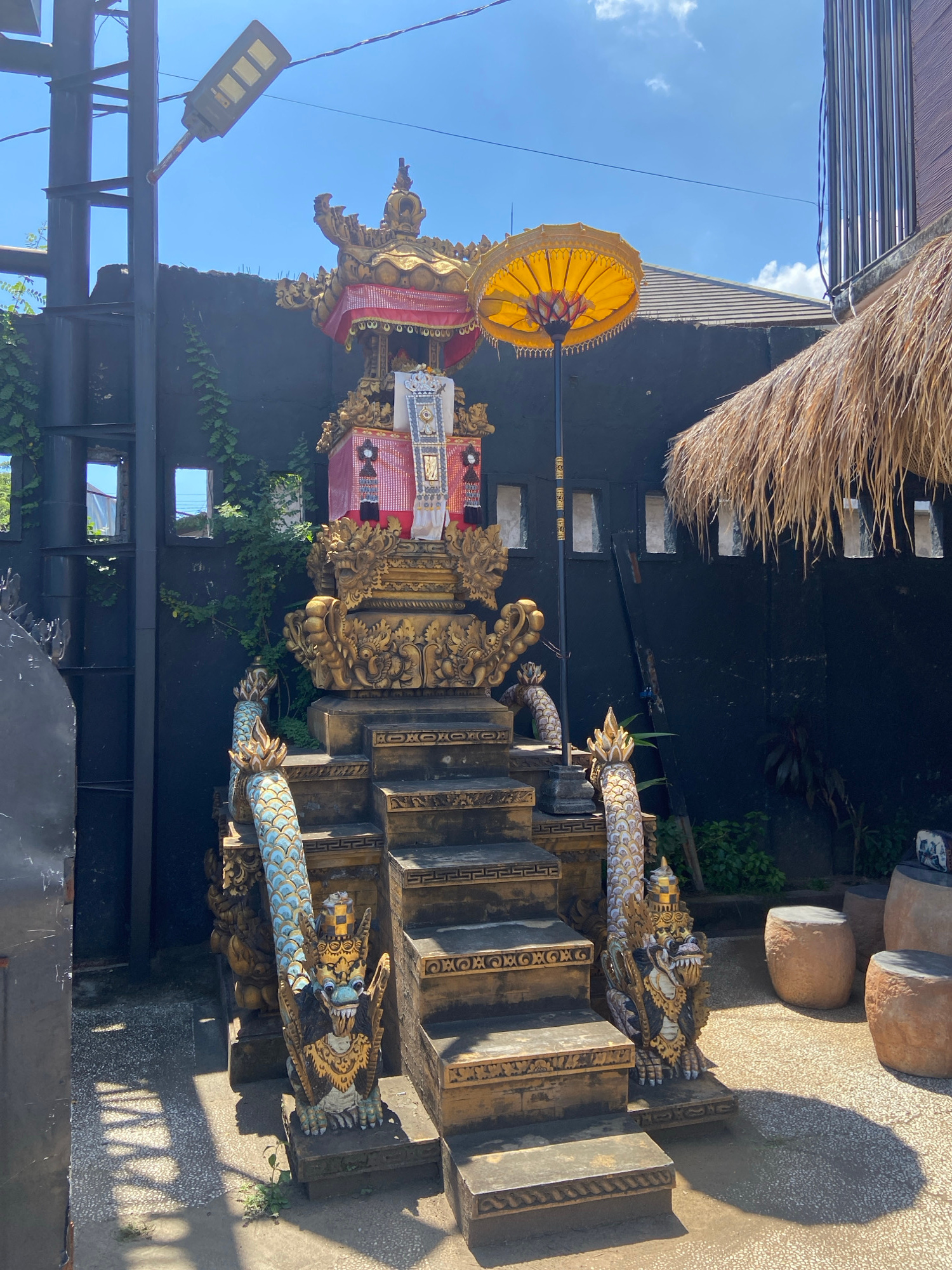 This photograph shows a multi-tiered Balinese shrine, likely a family temple, situated in Buleleng, Indonesia. The shrine features intricate gold carvings, ornate fabrics, and a large yellow parasol o…read more