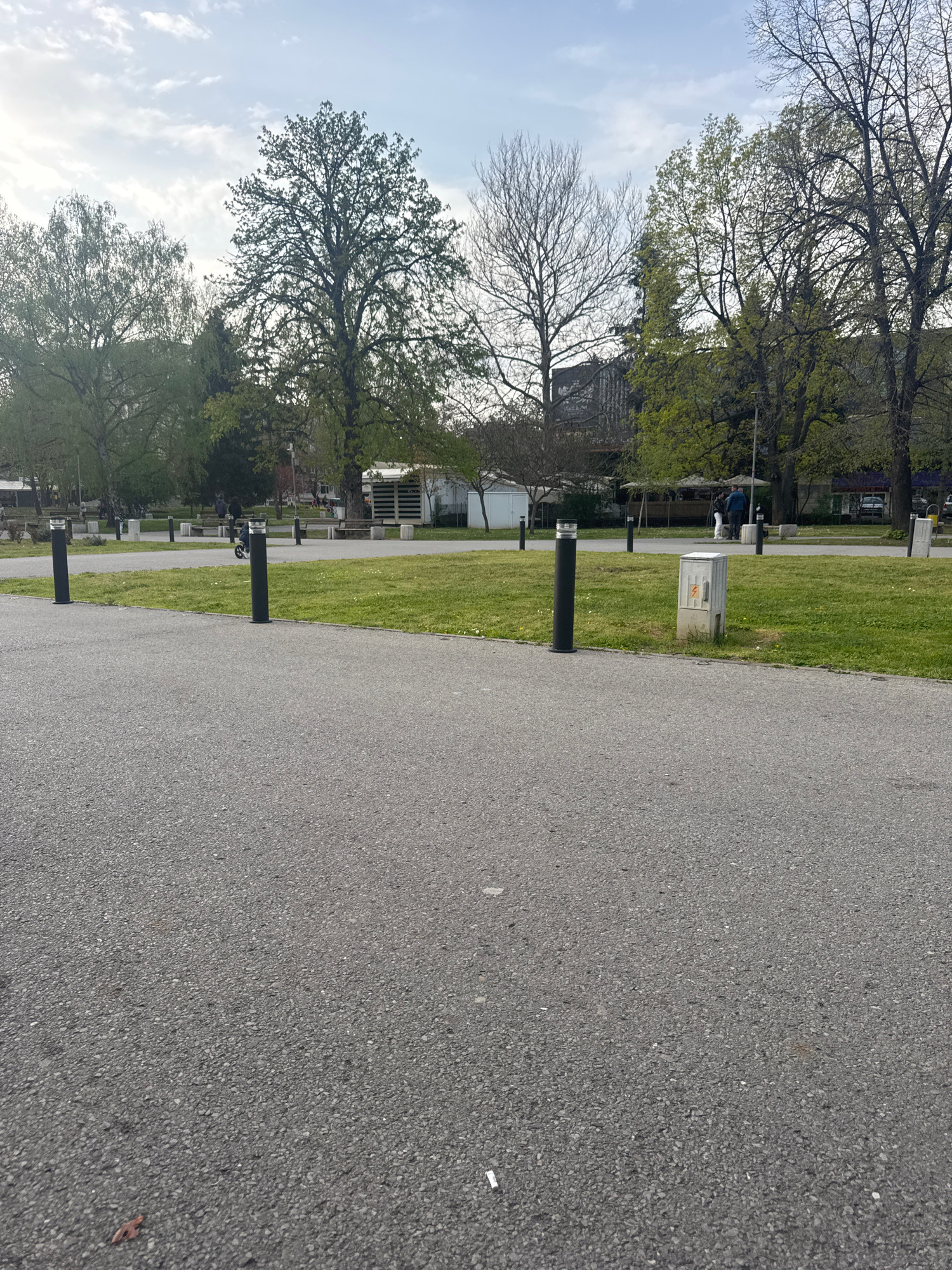 The image depicts an outdoor scene in Montana, Bulgaria, likely a park or cemetery. A grey asphalt road dominates the foreground, stretching into the distance. To the left of the road is a strip of gr…read more