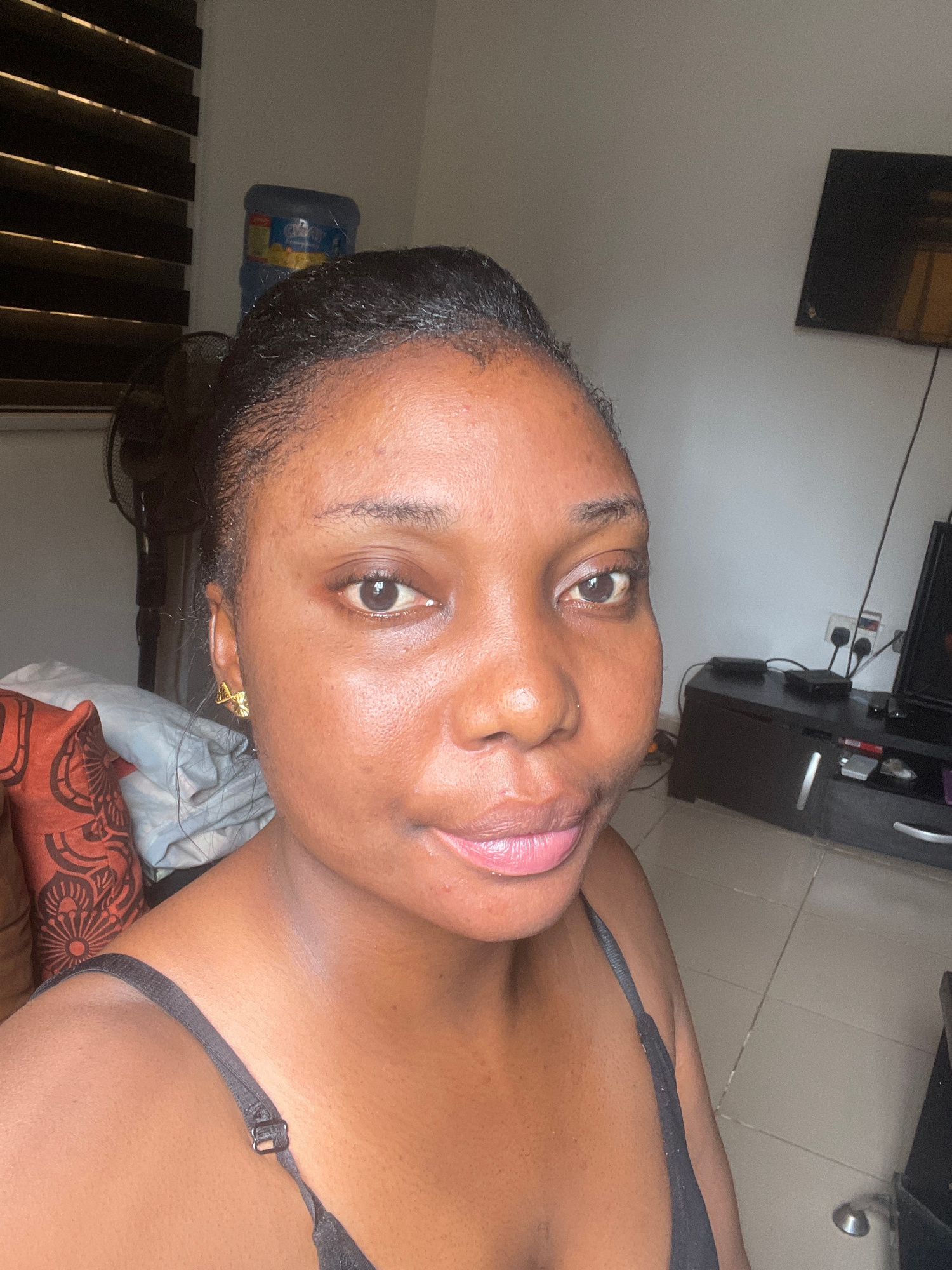A close-up selfie depicts a dark-skinned woman with short, dark hair. She is wearing a black bra with adjustable straps. Her lips are pink and her eyes are brown. She appears to be indoors, lying on a…read more