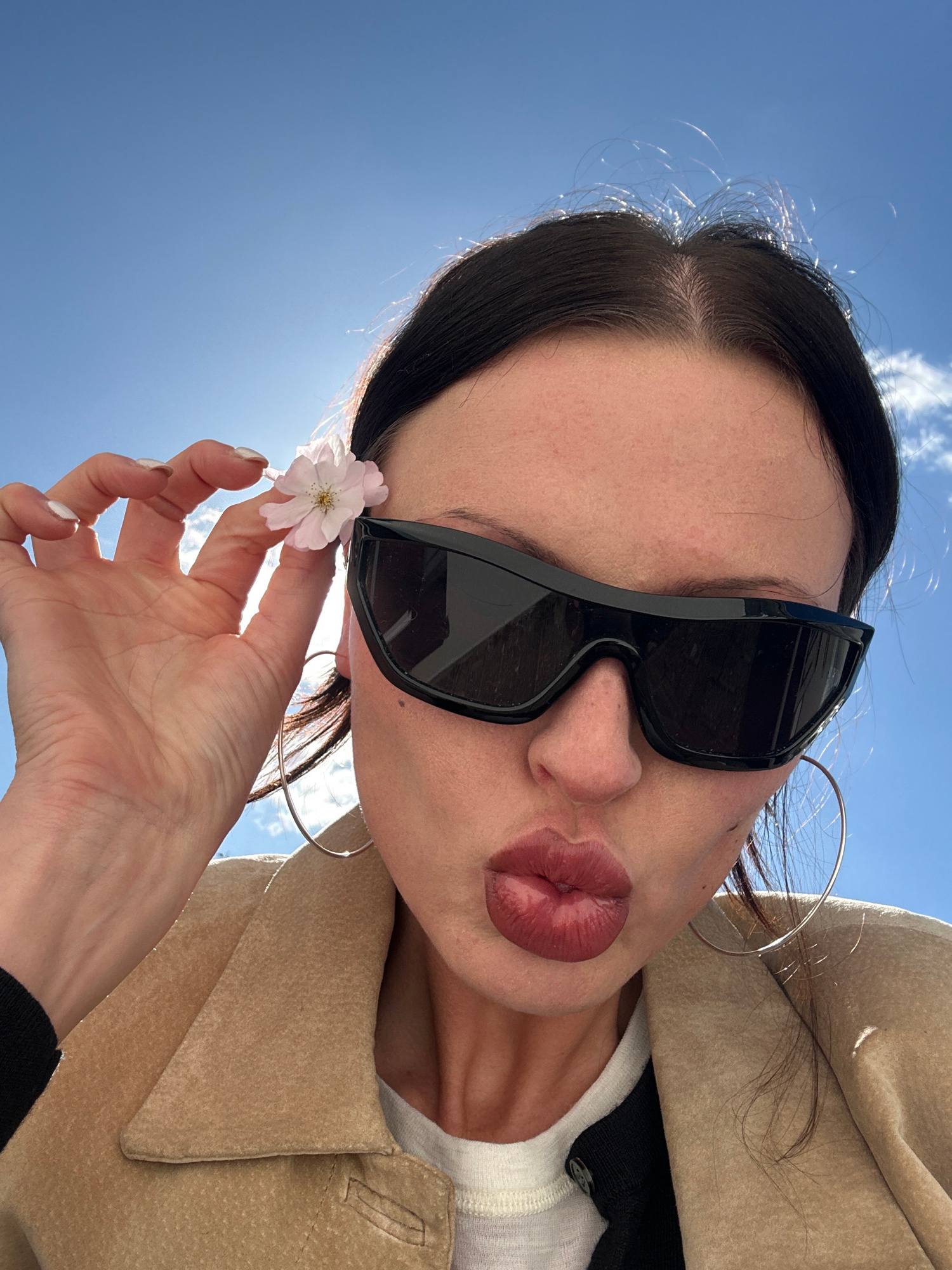 A close-up, low-angle photograph depicts an individual with dark hair and fair skin, centered against a clear blue sky with some white clouds. The person wears large, black, rectangular sunglasses and…read more
