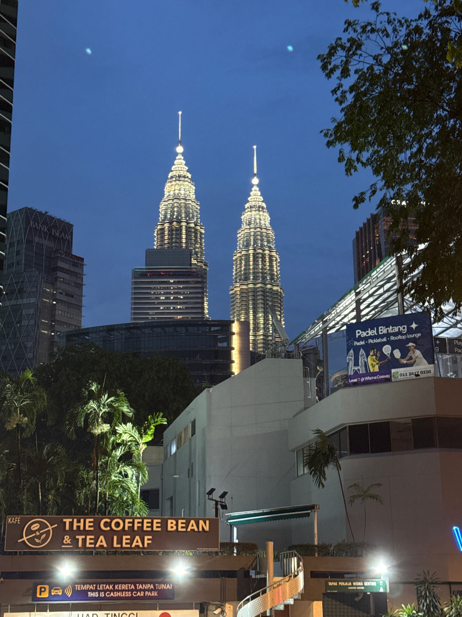 The image shows the Petronas Twin Towers at dusk in Kuala Lumpur, Malaysia. A branch from a tree is visible in the top left of the shot, partially obscuring the blue sky. The towers are brightly lit,…read more