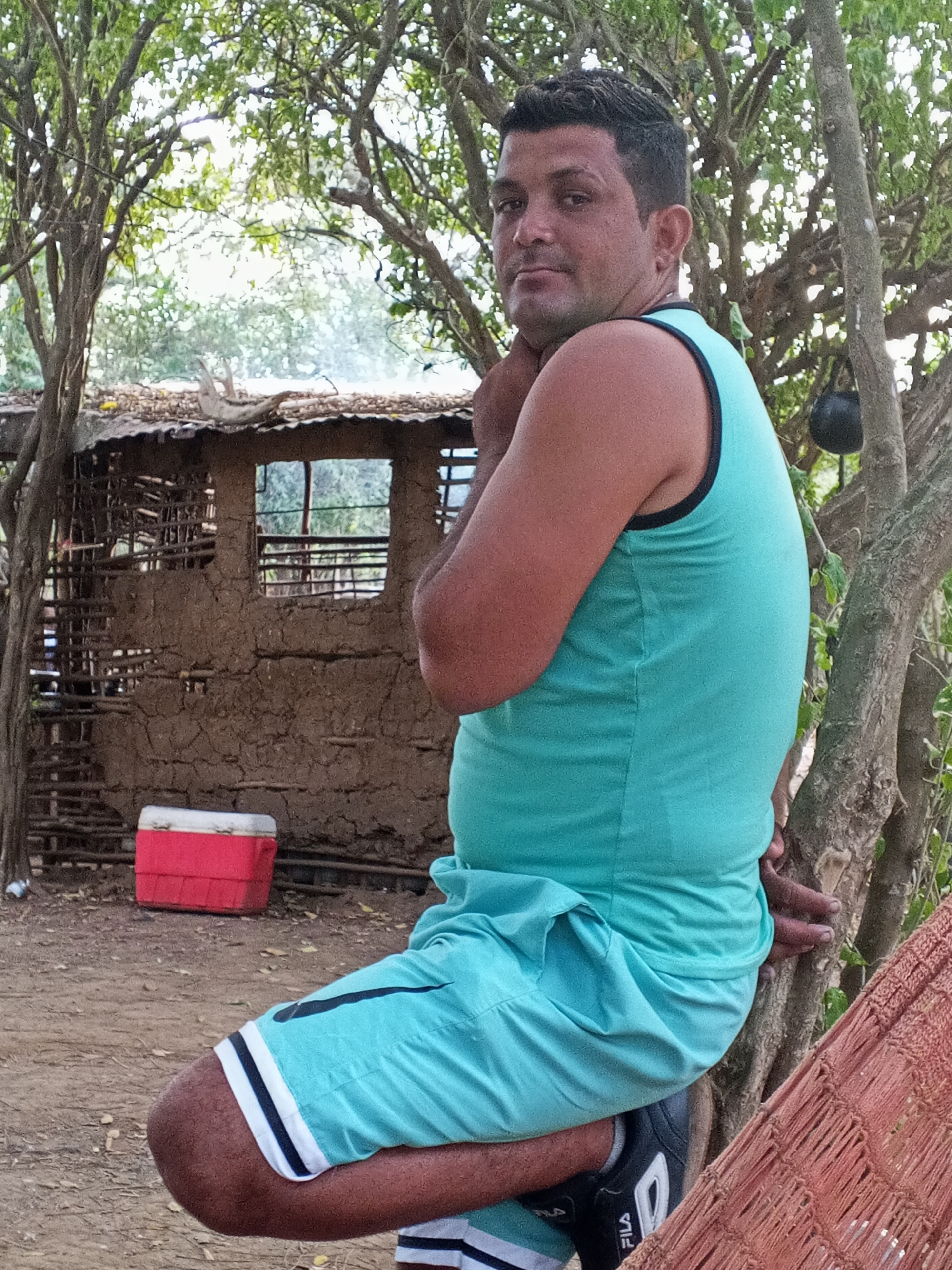 The image depicts a middle-aged man with short dark hair, wearing a light blue tank top with black trim and matching shorts with white stripes on the sides. He is posed seated, leaning against a tree,…read more