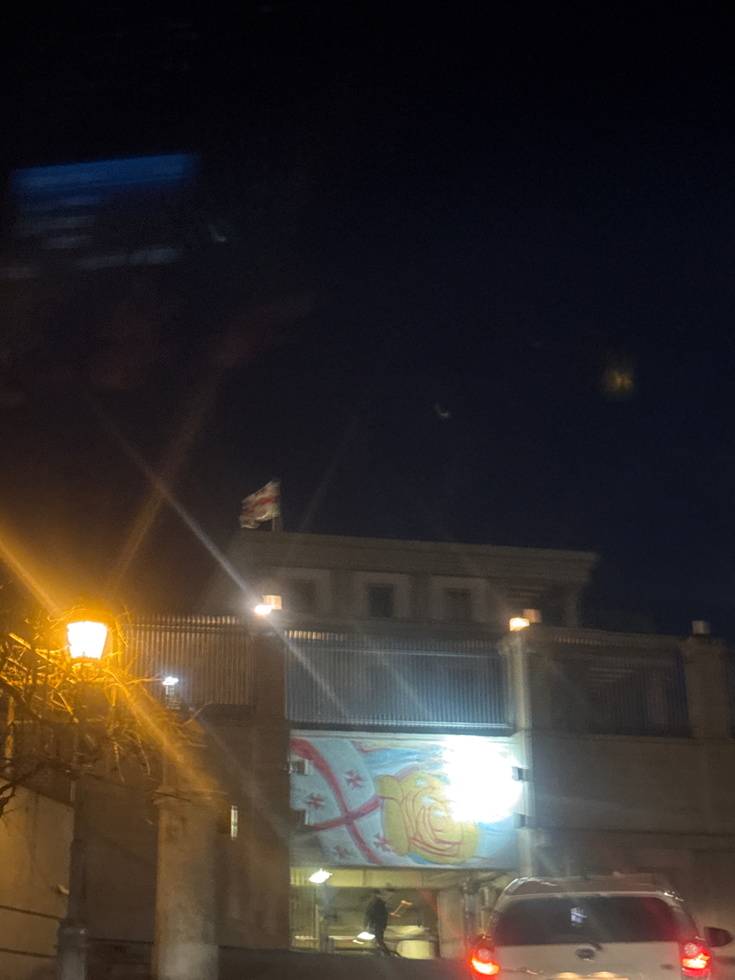 At night, the image depicts a building facade in Tbilisi, Georgia. A flag, possibly Georgian, is displayed on the building. An illuminated banner with a religious motif is visible. A street lamp proviβ¦read more