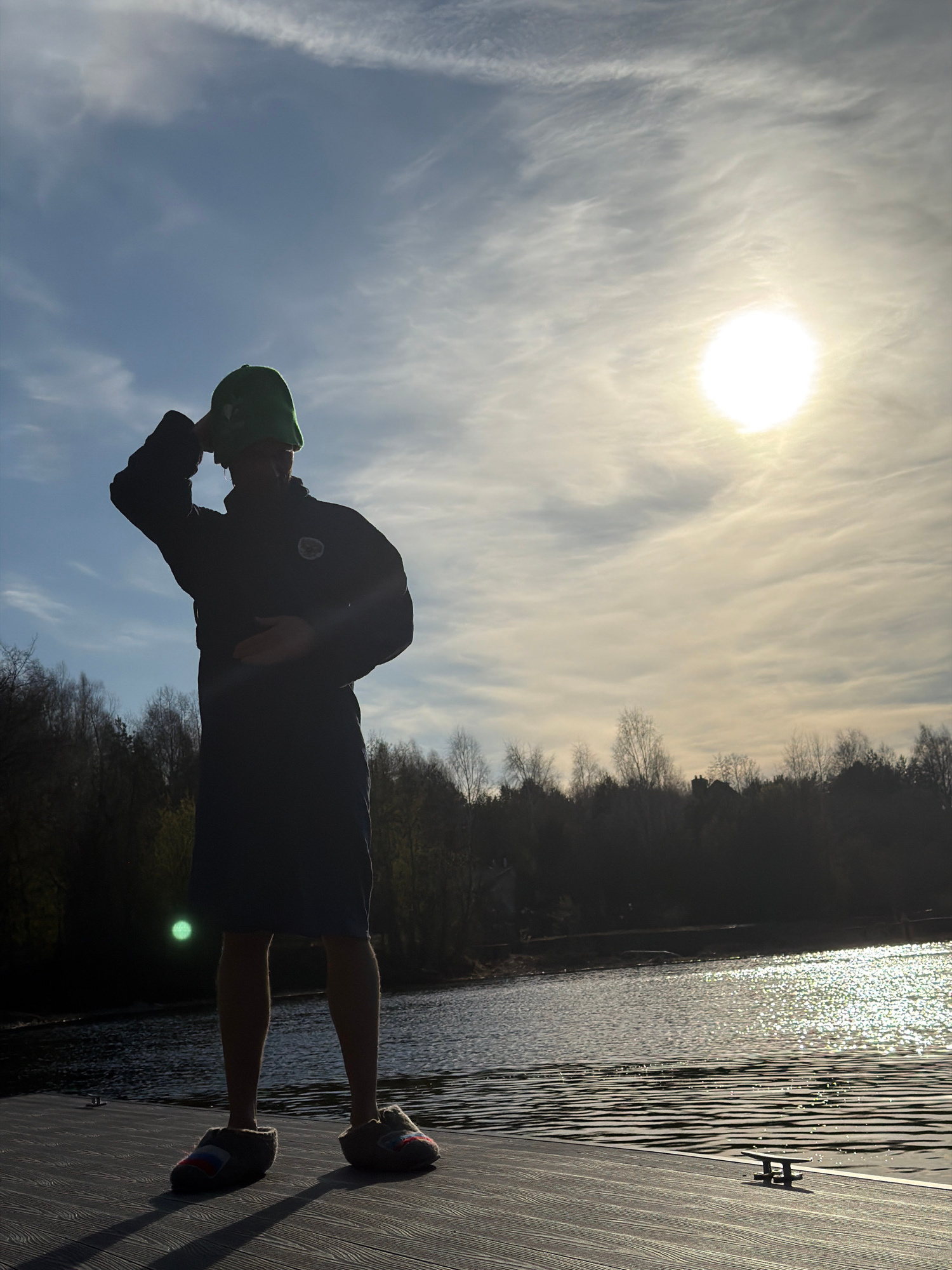 The image, set in Shchelkovo, Russia, portrays a person standing on a wooden dock by a body of water, strongly backlit by the sun. The individual is rendered in silhouette, facing towards the brillian…read more