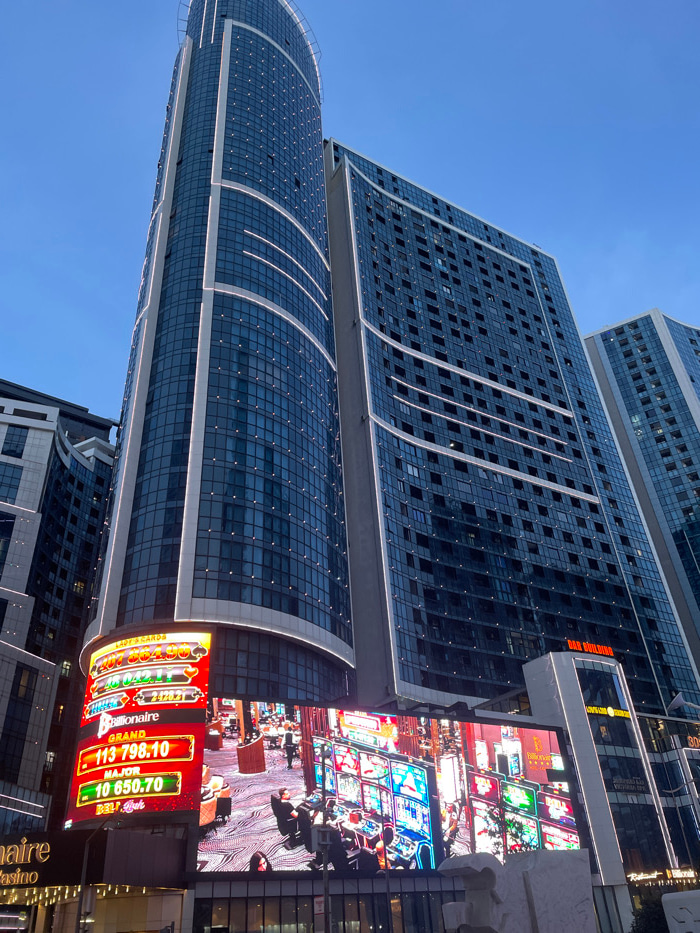 This image depicts a cluster of modern, high-rise buildings in Batumi, Georgia, likely in the area of the Leogrand Hotel & Casino (also known as Eclipse Casino or Courtyard by Marriott Batumi). The ce…read more
