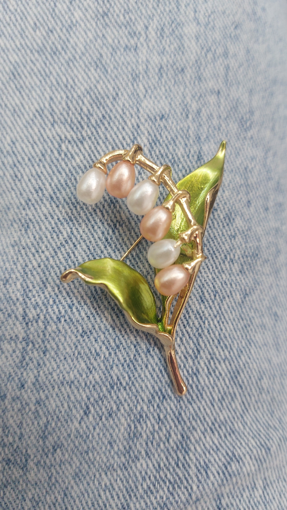 The image depicts a lily-of-the-valley brooch against a blue denim background. The brooch is gold-toned with two green leaves and several small, oval-shaped faux pearls in white and peach hues hanging…read more