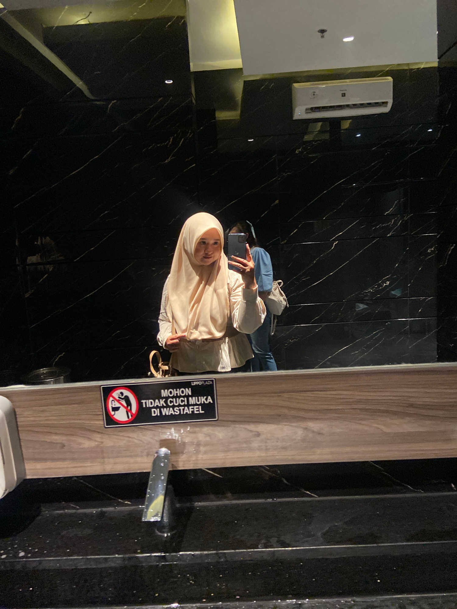 A woman wearing a headscarf is visible in a mirror's reflection. She is holding a phone and appears to be taking a picture of herself. The mirror is mounted on a wooden panel next to a black marble wa…read more