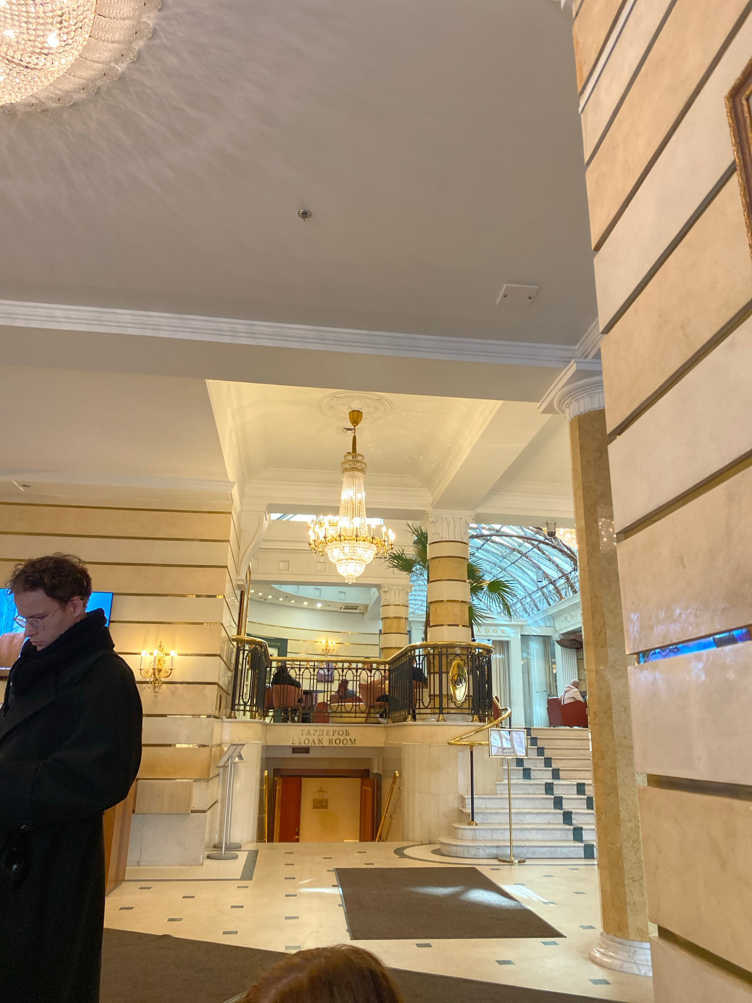 The image depicts a luxurious multi-level interior, likely a hotel lobby or grand public building, located in Saint Petersburg, Russia. The environment features classical architectural elements, incl…read more
